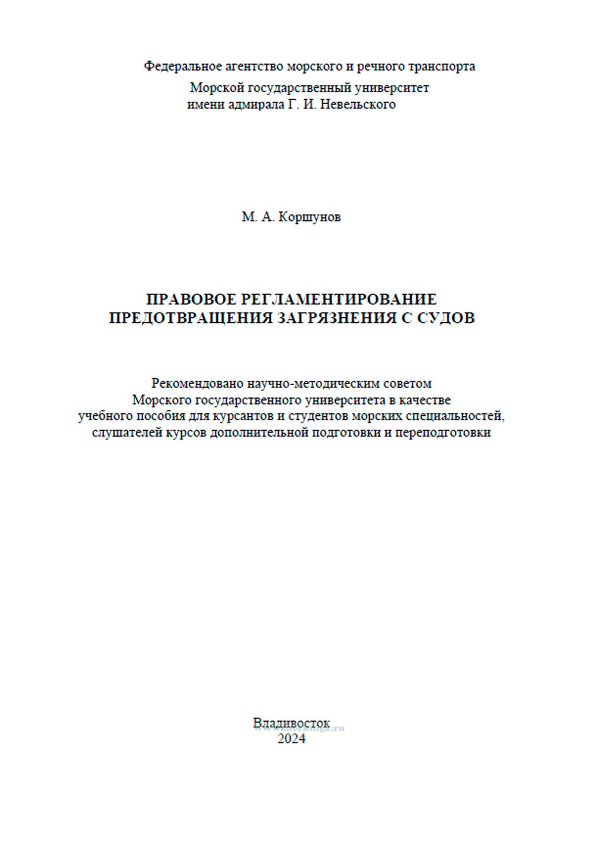 В учебном пособии приведены все изменения нормативных документов по состоянию на 01 июля 2024 года. Основное внимание уделено выполнению требований Международной конвенции МАРПОЛ 73/78 . Приведены примеры случаев загрязнения моря, процедуры проверки судов и наиболее характерные замечания инспекции государственного портового контроля. Прилагаются примеры ведения журналов операций с нефтью, мусором и сточными водами.