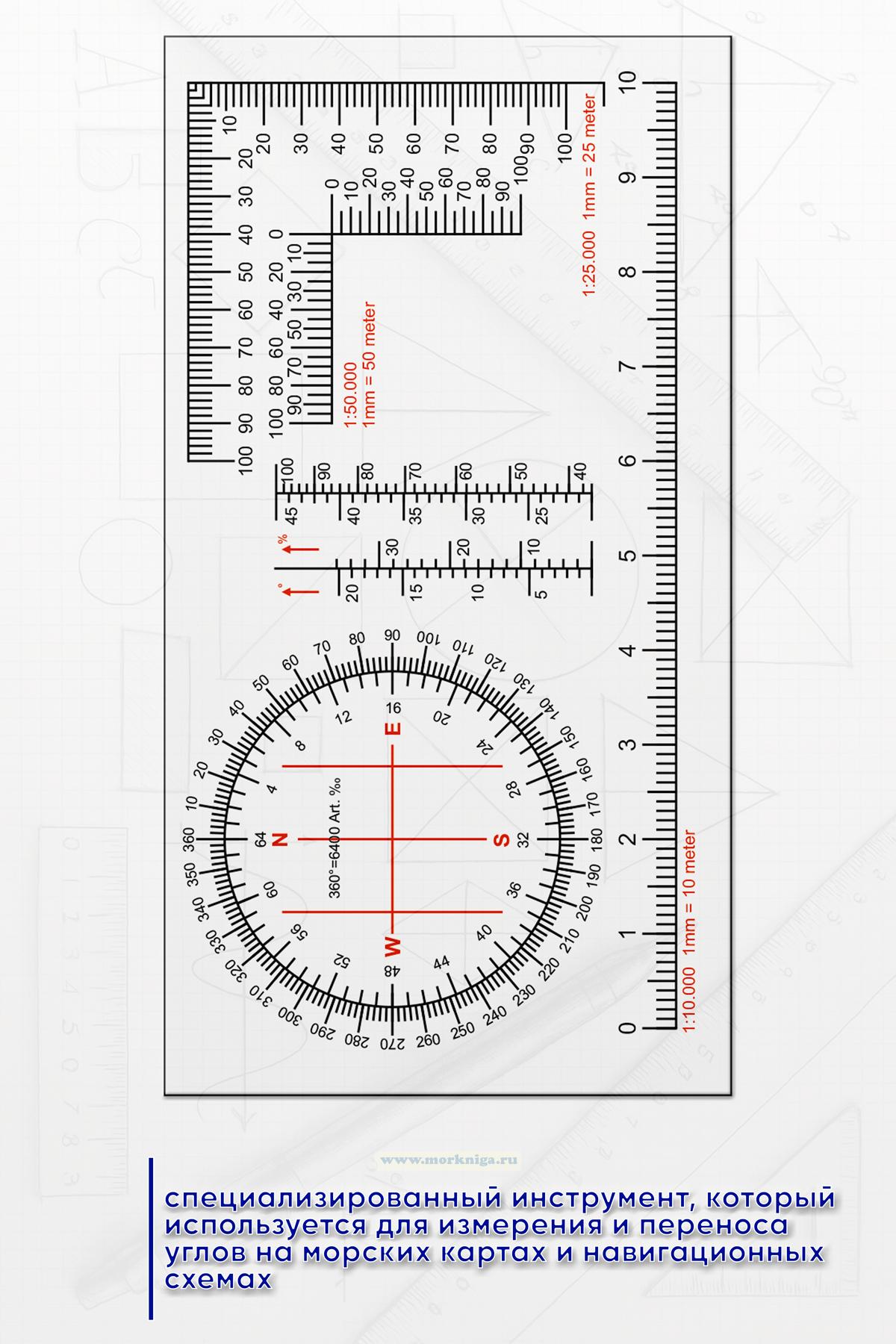 Картографический транспортир — это специализированный инструмент, который используется для измерения и переноса углов на морских картах и навигационных схемах