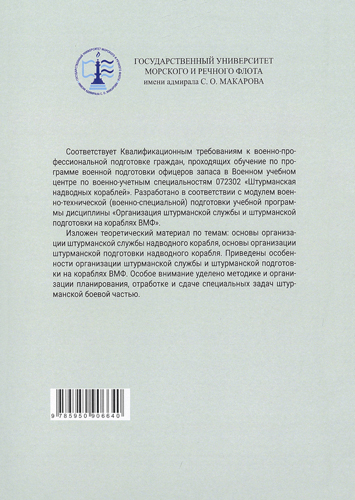 Соответствует Квалификационным требованиям к военно-профессиональной подготовке граждан, проходящих обучение по программе военной подготовки офицеров запаса в Военном учебном центре по военно-учетным специальностям 072302 "Штурманская надводных кораблей". Разработано в соответствии с модулем военно-технической (военно-специальной) подготовки учебной программы дисциплины "Организация штурманской службы и штурманской подготовки на кораблях ВМФ".
