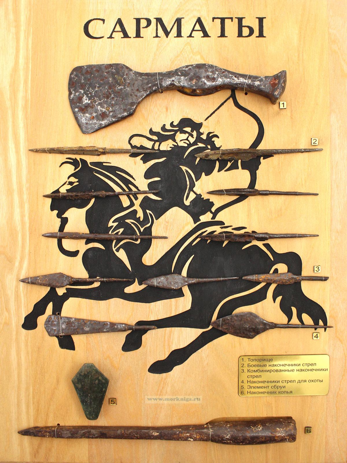 Историческая коллекция оружия сарматов — кочевого народа, игравшего важную роль в истории Евразии. Деревянный стенд с силуэтом всадника украшен подлинными металлическими элементами, типичными образцами вооружения: наконечники стрел, копья, элементы сбруи и топорище.