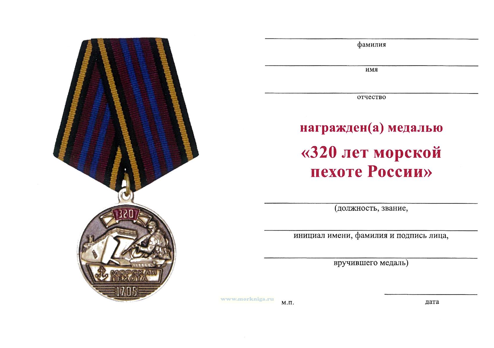 Отлита из латуни, соединена круглым колечком с колодкой, обёрнутой цветной лентой из полос чёрного, оранжевого, красного и синего цветов. На лицевой стороне находится изображение бойца-пехотинца, а также боевого корабля и танка. Выше на фигурной вставке красного цвета юбилейная дата "320", ниже - рисунок якоря и надпись "МОРСКАЯ ПЕХОТА", среди декоративных линий год "1705", от которого ведётся история войск. На оборотной стороне медали центральную часть занимает изображение якоря, обвитого канатом. По окружности сверху можно прочесть девиз "ГДЕ МЫ, ТАМ - ПОБЕДА!". По нижней дуге расположены лавровые ветки, расходящиеся в разные стороны и элементы витой ленты.