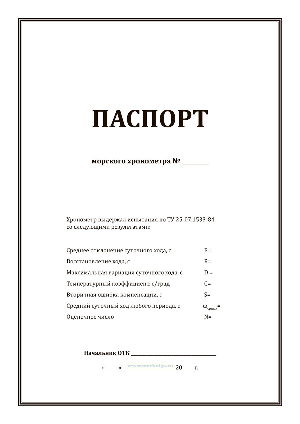 Паспорт морского хронометра содержит технические характеристики и результаты испытаний изделия согласно требованиям ТУ 25-07.1533-84. В документе отражены показатели точности хода, температурные коэффициенты, восстановление и вариации суточного хода, расчёт оценочного числа, а также сведения о содержании драгоценных металлов и камней. Паспорт удостоверяет пригодность хронометра к эксплуатации и содержит данные о гарантийных сроках хранения и использования.
