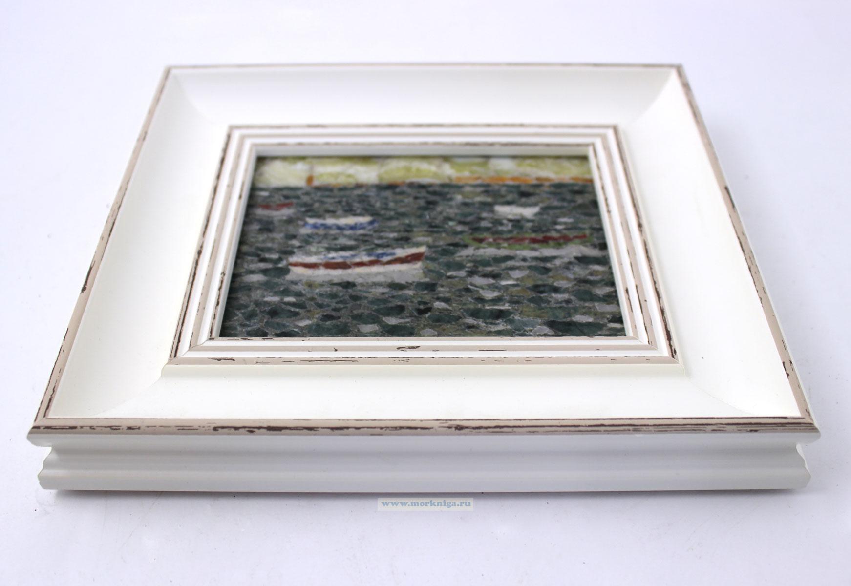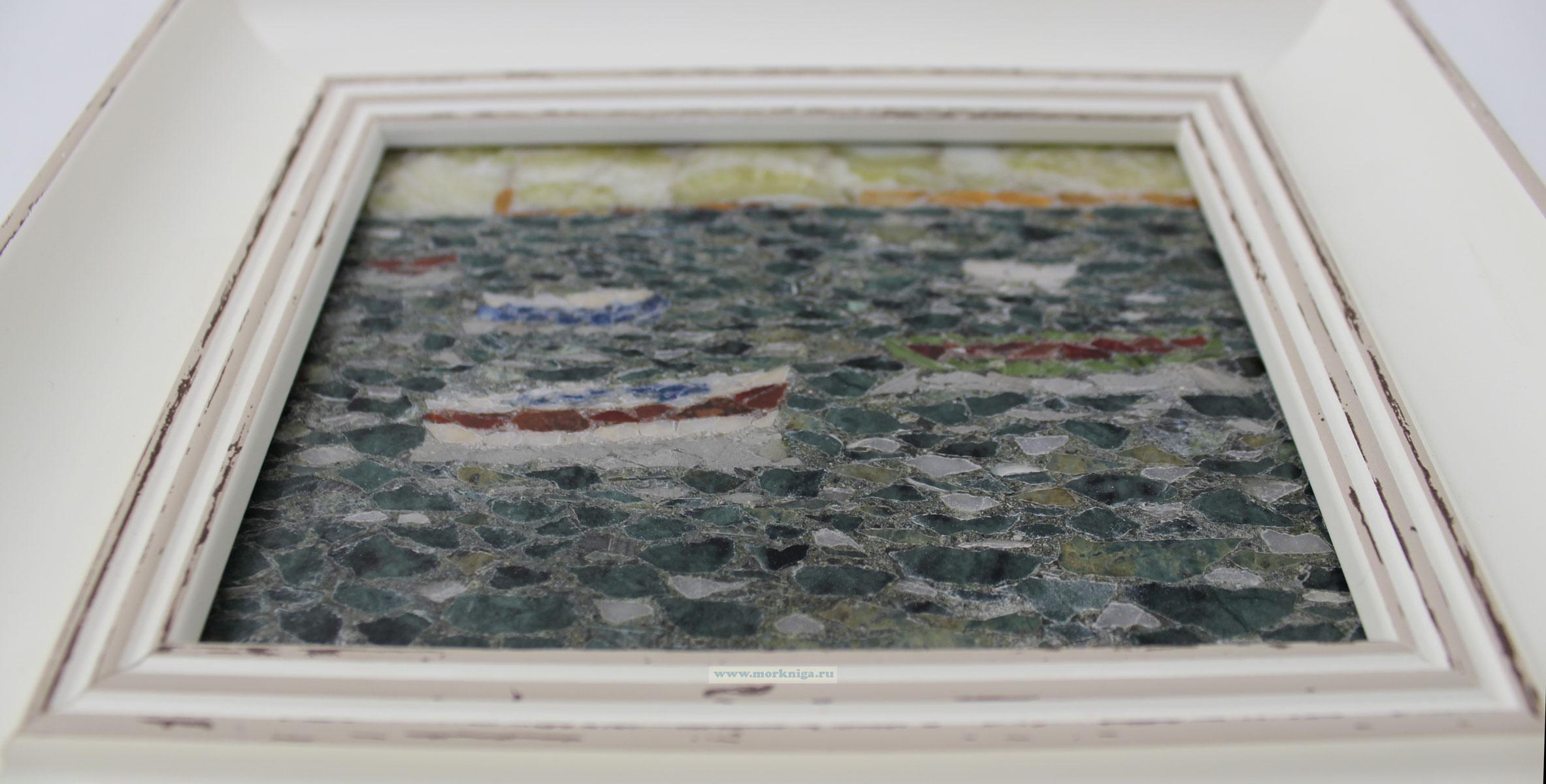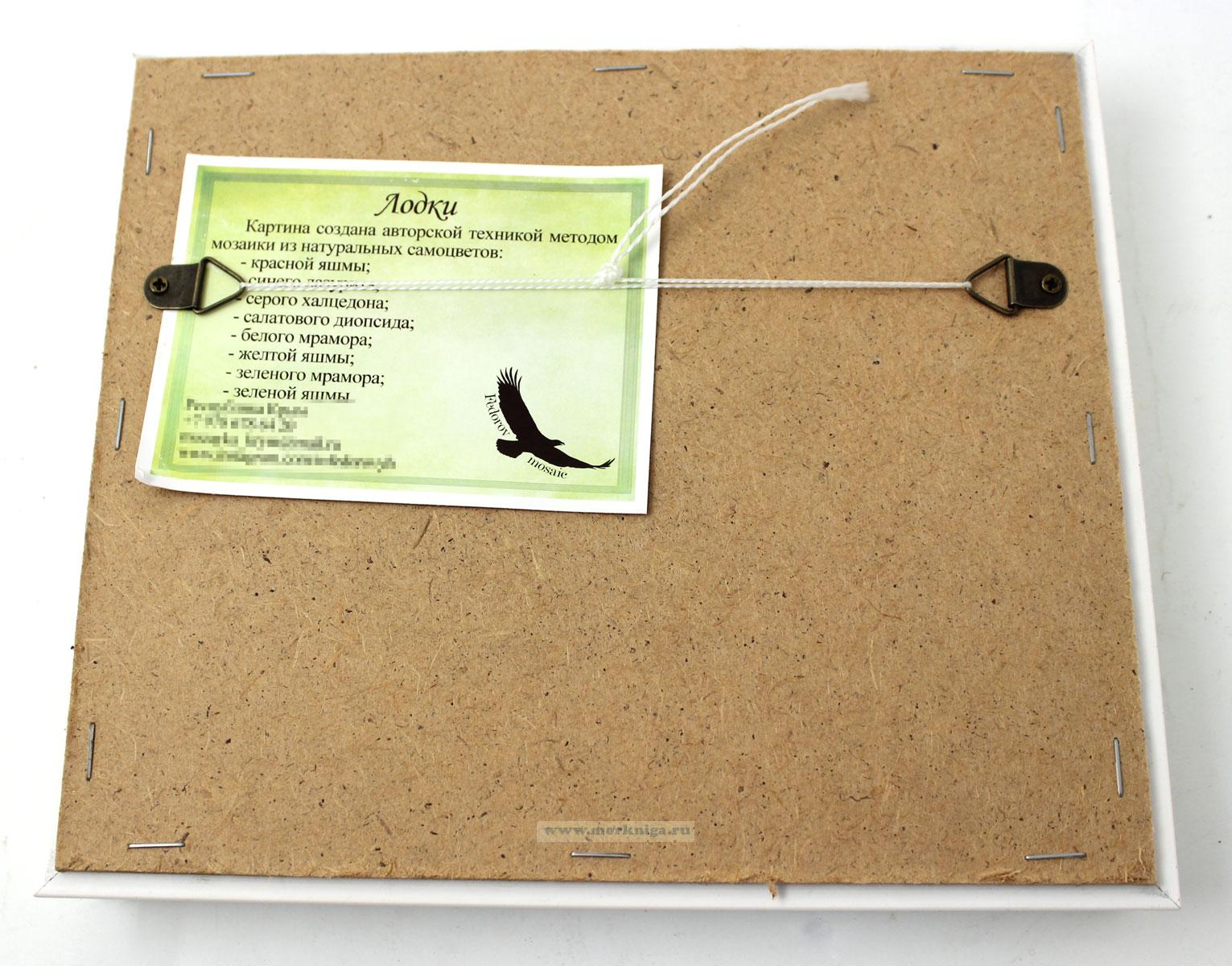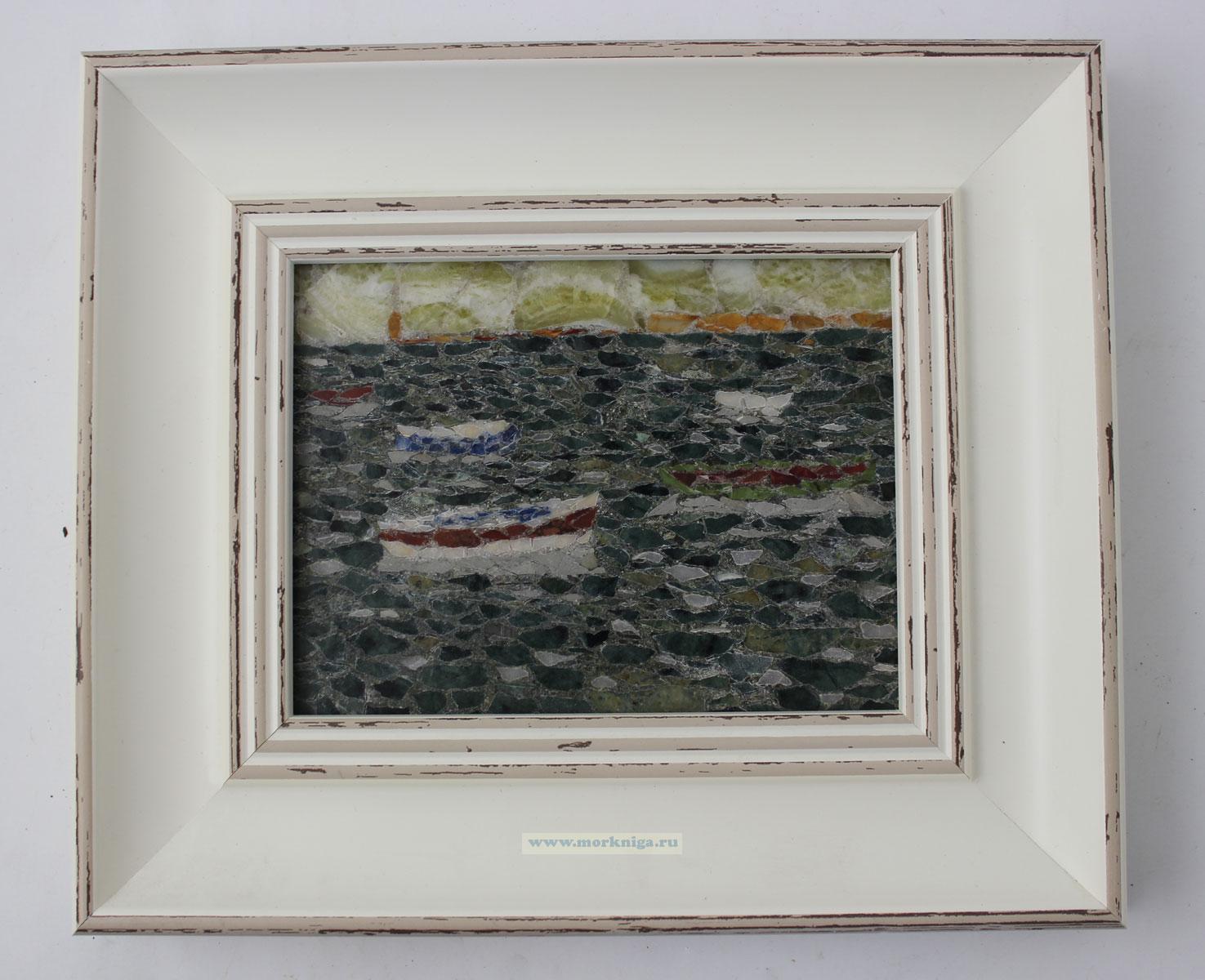 Авторская картина, выполненная вручную в технике мозаики из натуральных самоцветов. Композиция с лодками на воде создаёт атмосферу спокойствия и уюта, а природные камни придают изображению глубину, фактуру и естественное сияние.