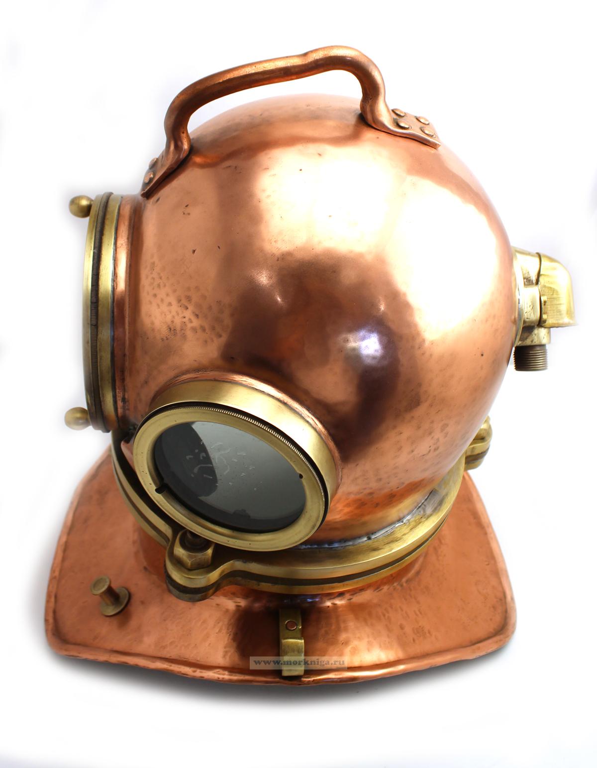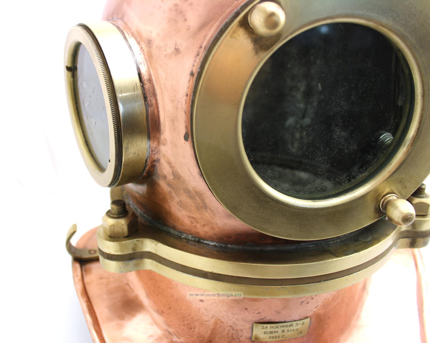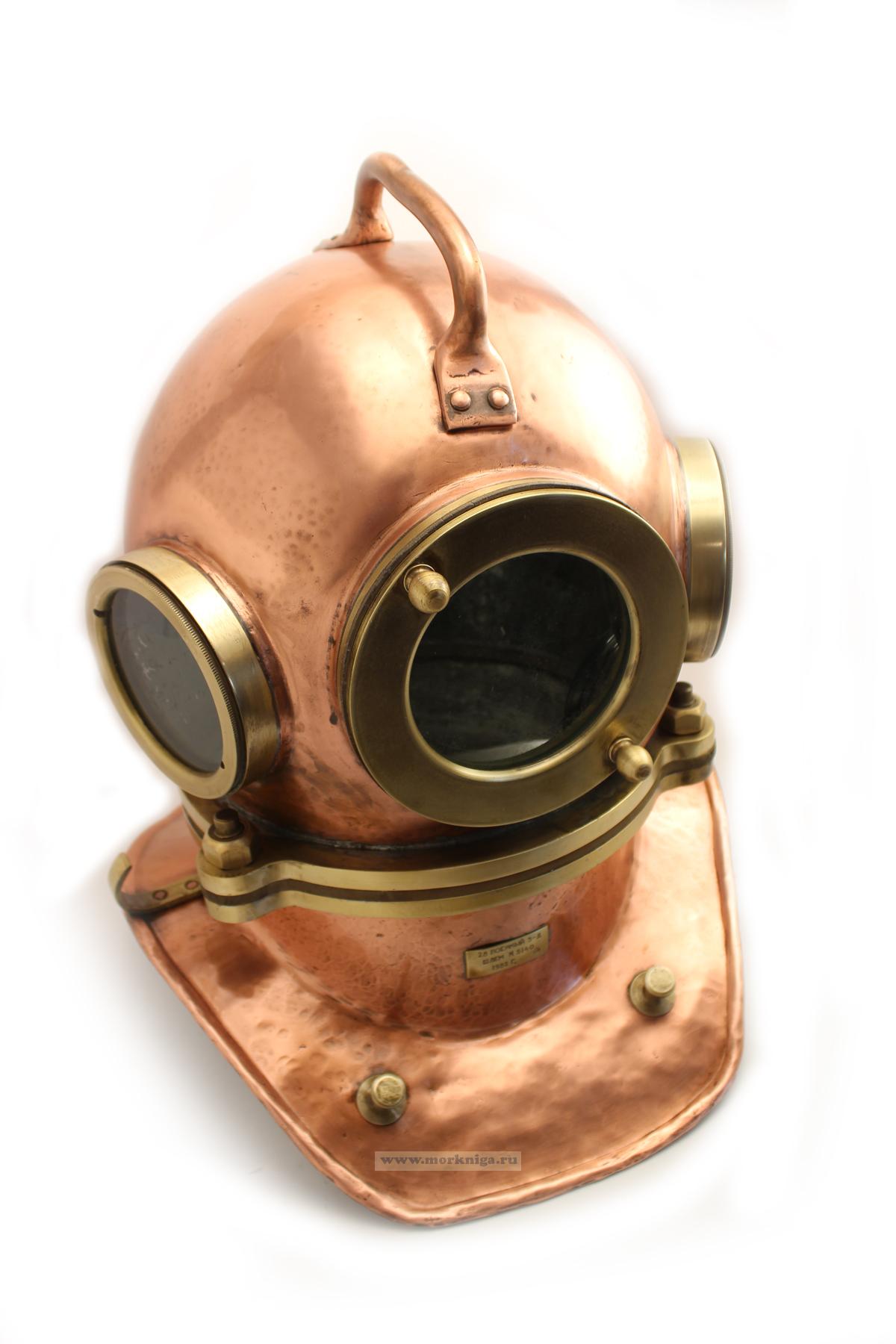 Аутентичный водолазный шлем военно-морского флота СССР, выпущенный в 1982 году на 28-м военном заводе. Изготовлен из полированной меди с латунными элементами. Использовался в профессиональном снаряжении для глубоководных работ, имеет заводскую табличку с номером и годом.