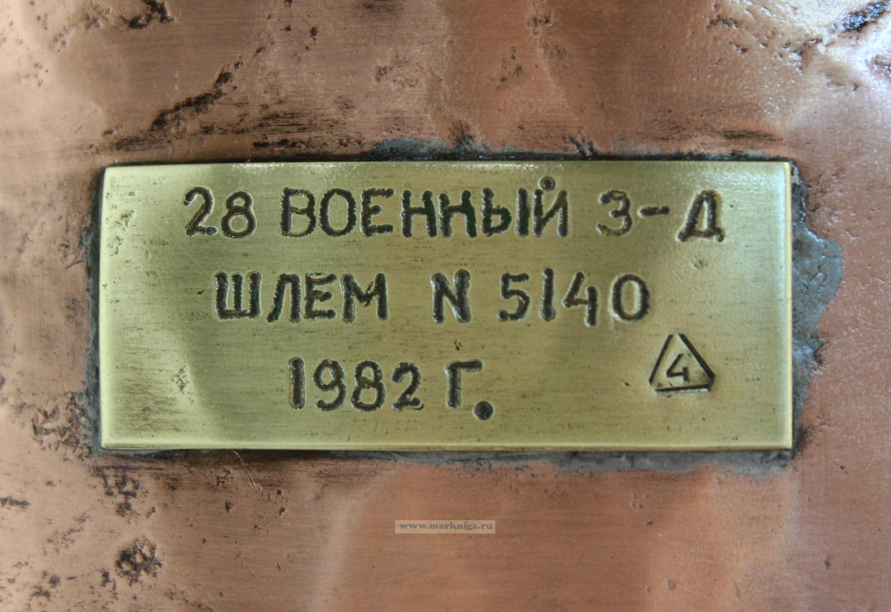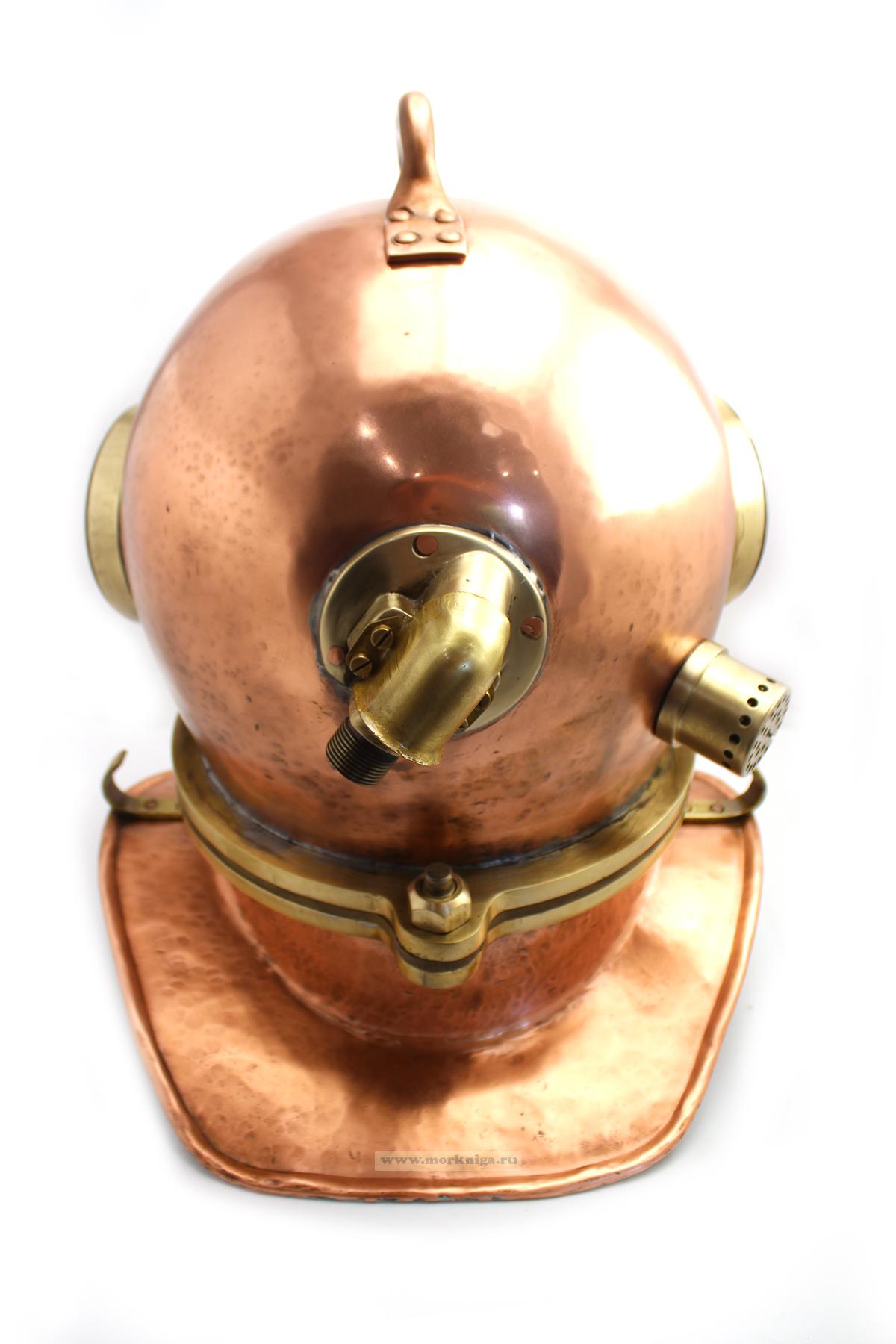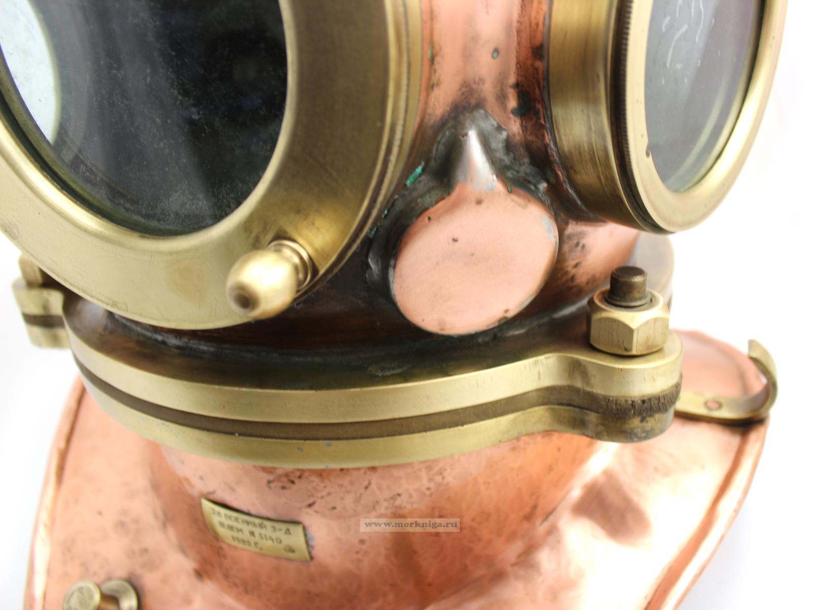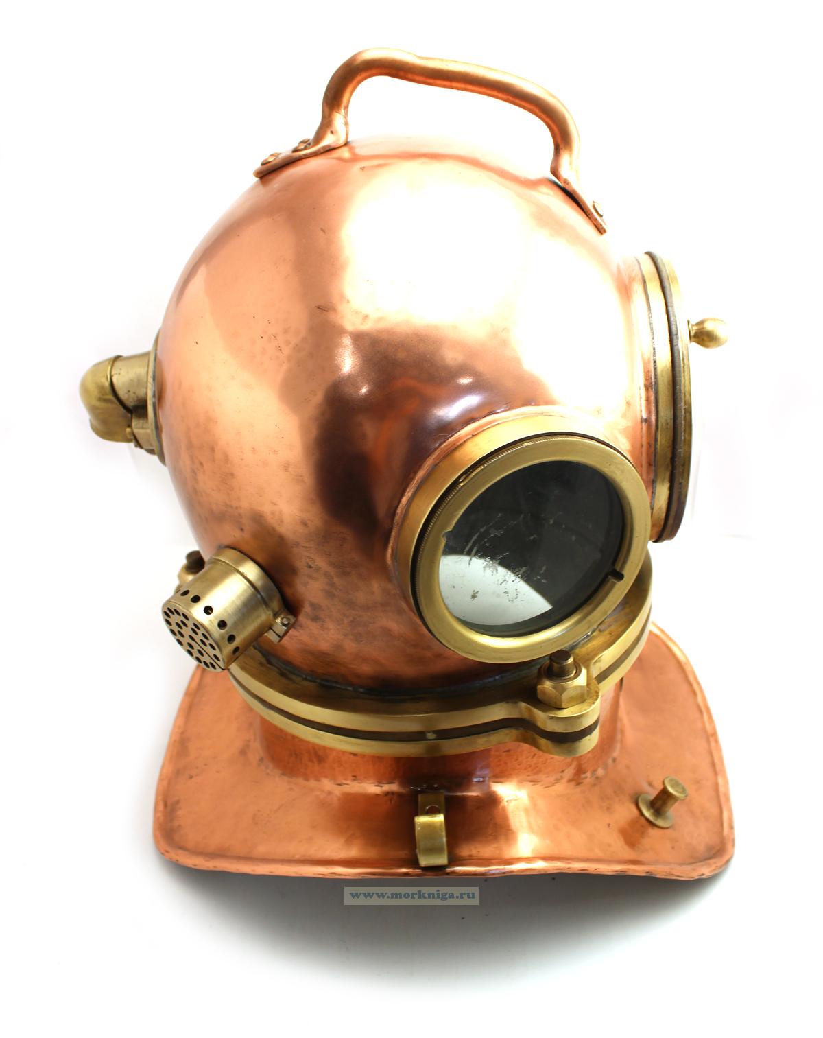 Аутентичный водолазный шлем военно-морского флота СССР, выпущенный в 1982 году на 28-м военном заводе. Изготовлен из полированной меди с латунными элементами. Использовался в профессиональном снаряжении для глубоководных работ, имеет заводскую табличку с номером и годом.