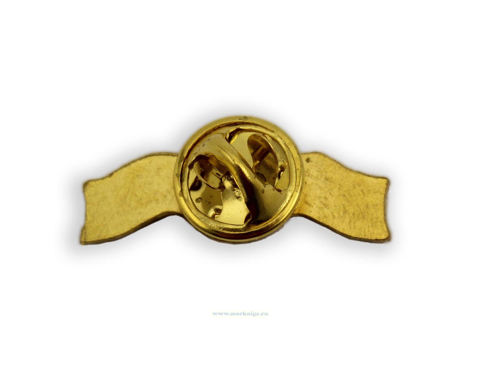 В центре значка находится круглый медальон с черной эмалью, на котором изображен золотистый морской якорь. Медальон обрамлен узким красным кантом с золотистым краем. По бокам размещены эмблемы морской пехоты: флаг Военно-Морского Флота СССР и Андреевский флаг.