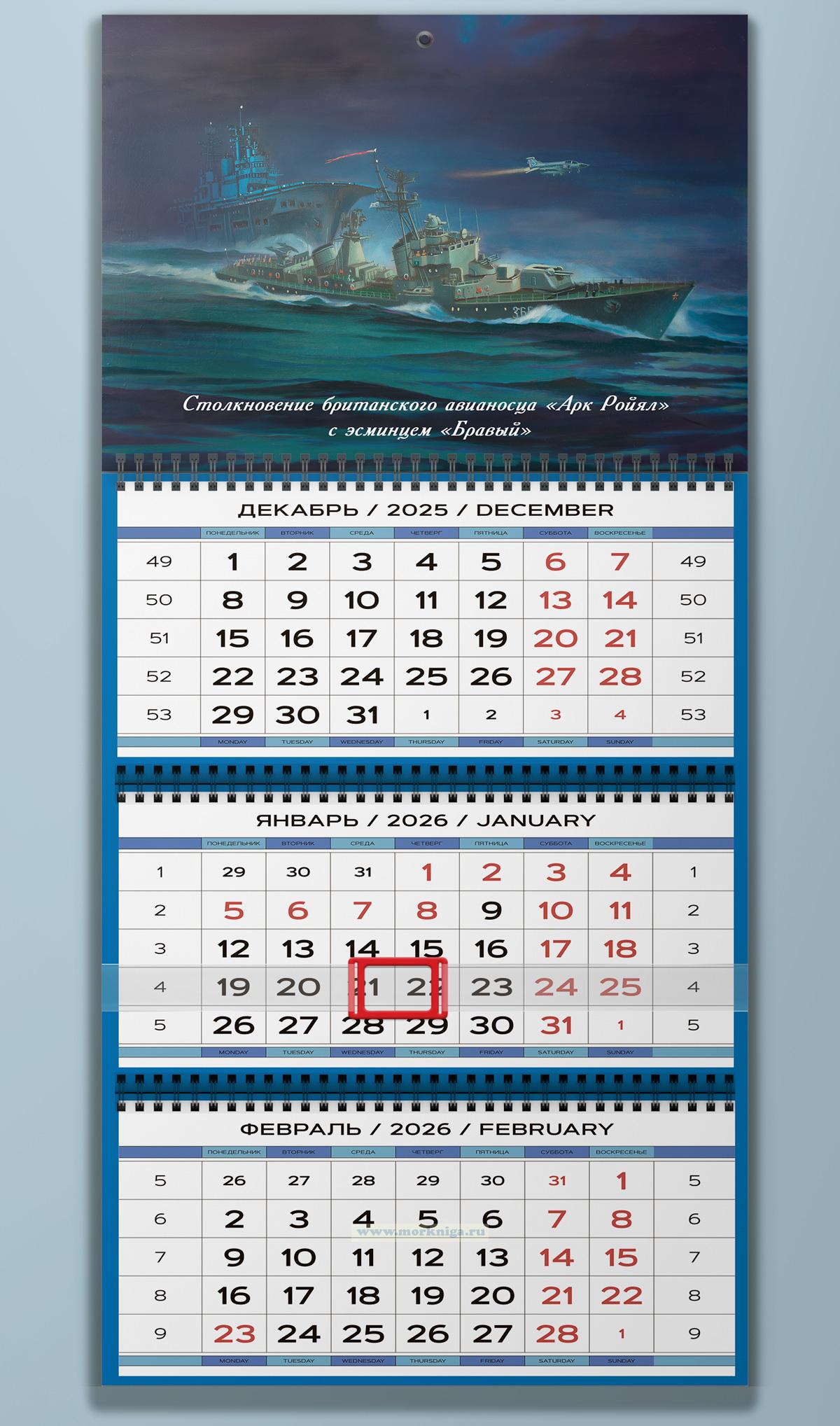 Квартальный календарь - чрезвычайно удобная версия настенного календаря. Позволяет видеть одновременно календарные сетки трех месяцев: текущего, предыдущего и следующего. Настенные квартальные календари идеально подходят для планирования. Важные даты можно отмечать прямо на календаре. На обложке изображена картина художника-мариниста Андрея Лубянова "Столкновение британского авианосца "Арк Ройял" с эсминцем "Бравый""