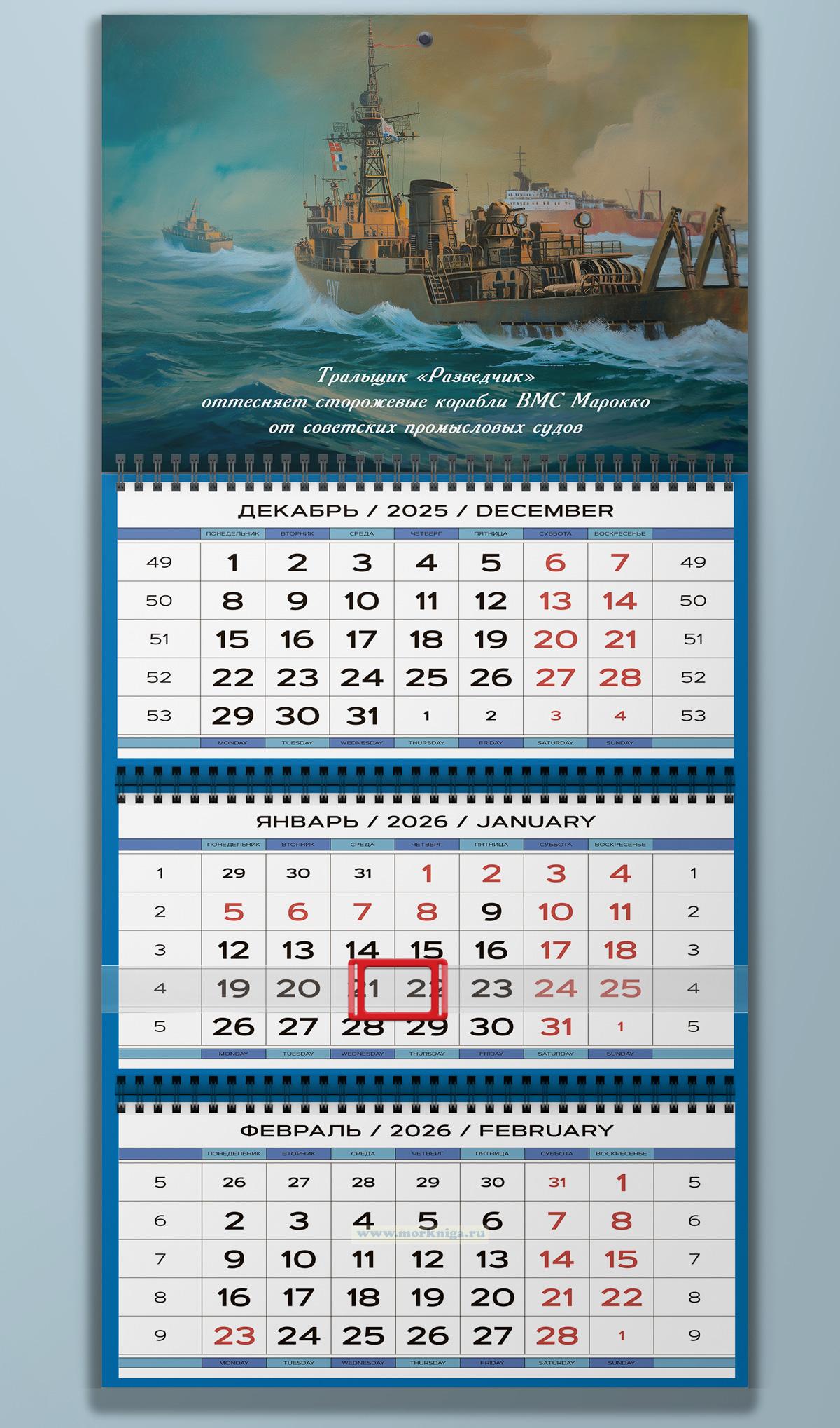 Квартальный календарь - чрезвычайно удобная версия настенного календаря. Позволяет видеть одновременно календарные сетки трех месяцев: текущего, предыдущего и следующего. Настенные квартальные календари идеально подходят для планирования. Важные даты можно отмечать прямо на календаре. На обложке изображена картина художника-мариниста Андрея Лубянова "Тральщик "Разведчик" оттесняет сторожевые корабли ВМС Марокко от советских промысловых судов"