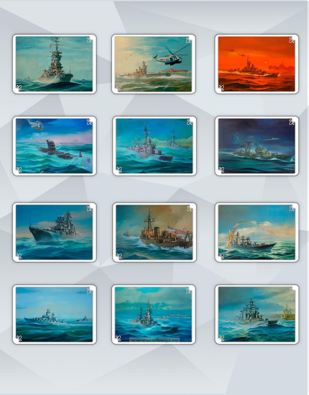 Набор открыток содержит изображения 12 работ художника-мариниста Андрея Лубянова: - Крейсер "Михаил Кутузов" - Противолодочный крейсер "Москва" - Сторожевой корабль проекта 50 в Средиземном море - Подводная лодка проекта 641 в Атлантике - Эсминец "Солидный" и крейсер "Адмирал Ушаков" в Средиземном море - Столкновение британского авианосца "Арк Ройял" с эсминцем "Бравый" - БПК "Керчь" на боевой службе - Тральщик "Разведчик" оттесняет сторожевые корабли ВМС Марокко от советских промысловых судов - БПК "Азов" выполняет ракетную стрельбу из ЗРК "Форт" - Ракетный крейсер "Слава" и СКР "Сметливый" следуют на Мальту для встречи президентов СССР и США - Крейсер "Адмирал Ушаков" наблюдает за американским авианосцем в Средиземном море - БПК проекта 61 наблюдает за американским авианосцем в Средиземном море