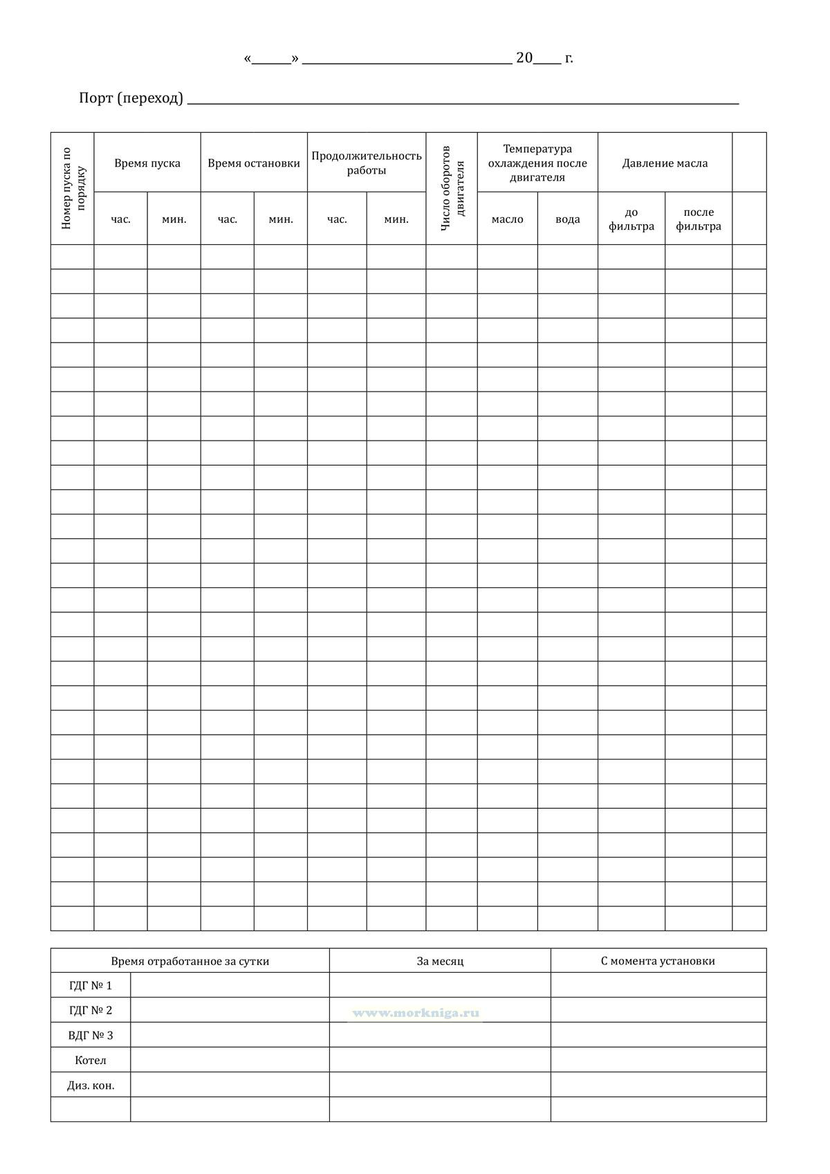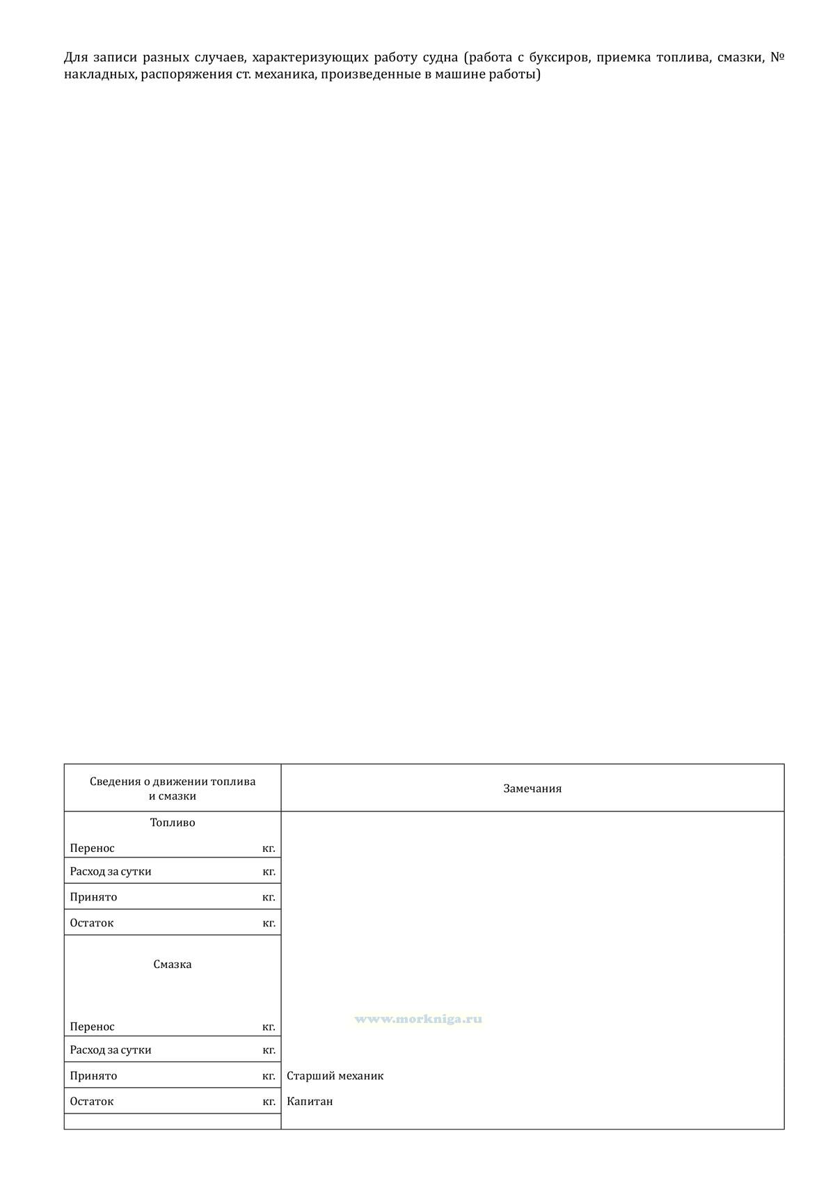 Для записи разных случаев, характеризующих работу судна (работа с буксиров, приемка топлива, смазки, № накладных, распоряжения ст. механика, произведенные в машине работы)