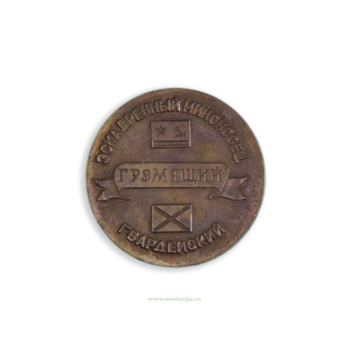 На реверсе размещены надписи: "Эскадренный миноносец" в верхней части и "Гвардейский" внизу, в центре на ленте имя корабля "ГРЁМЯЩИЙ". Также изображены флаги военно-морской и гвардейский, подчёркивающие статус судна как гвардейского боевого корабля. Миноносец "Гремящий" получил широкую известность за боевые заслуги в годы войны, в том числе за действия на Северном флоте, где он сопровождал конвои, участвовал в отражении налетов и артиллерийской поддержке сухопутных войск.