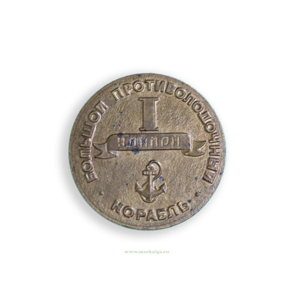 На лицевой стороне изображен корабль с развевающимися над ним военно-морским флагом СССР, что подчеркивает принадлежность судна к Военно-морскому флоту Советского Союза, на обратной стороне надпись по кругу "Большой противолодочный корабль" в середине римская цифра 1 означающая первый корабль проекта, на ленте надпись "Удалой" под ней изображен якорь.