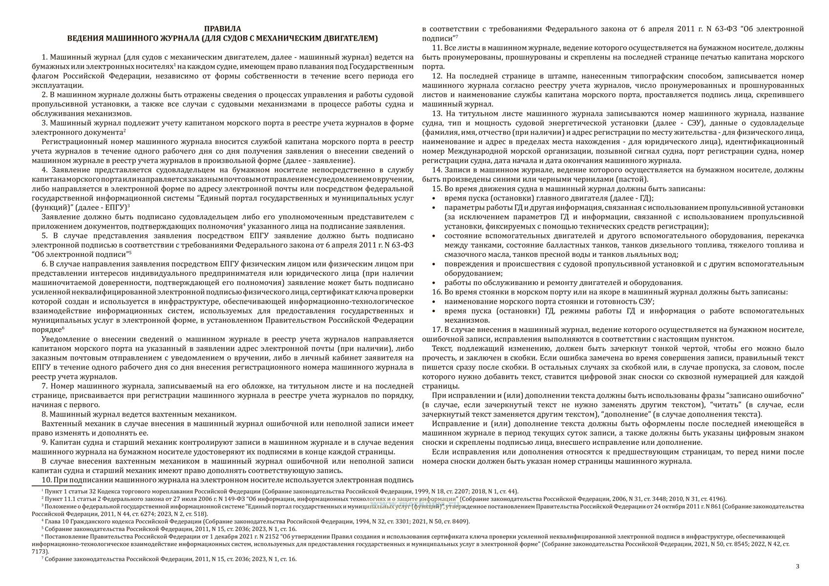 Машинный журнал применяется на судах с механическим двигателем для документирования всех процессов, связанных с работой судовой энергетической установки. В него заносятся данные о запуске и остановке главного двигателя, параметрах его работы, состоянии вспомогательных механизмов, перекачке топлива и воды, происшествиях с оборудованием, проведённом техническом обслуживании и ремонте, а также другие сведения, касающиеся эксплуатации судовой машины. Журнал ведется вахтенным механиком, контролируется старшим механиком и капитаном судна, и подлежит регистрации в реестре учёта журналов службы капитана морского порта.