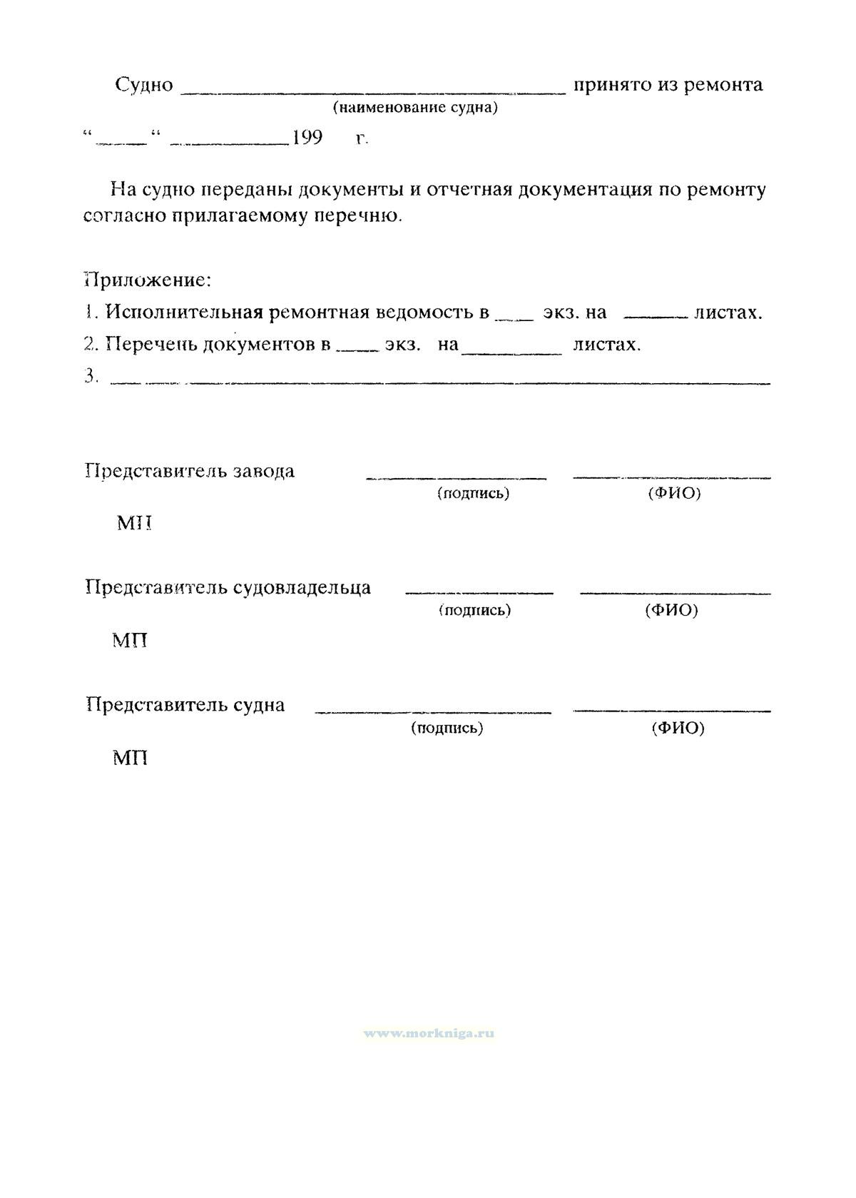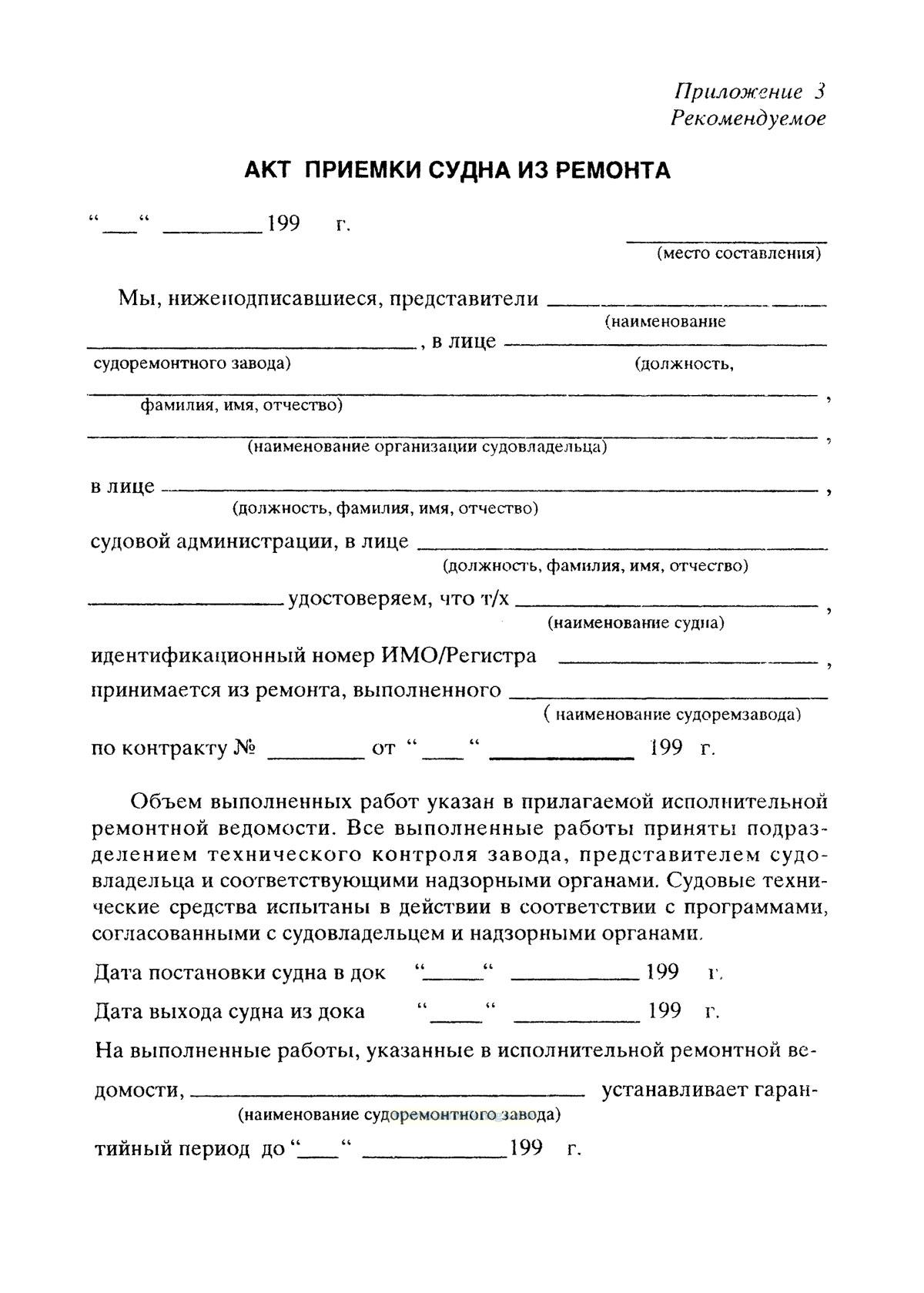 Форма Акта приемки судна из ремонта соответствует Приложению N 3 к РД 31.20.01-97. "Правила технической эксплуатации морских судов. Основное руководство" утв. Минтрансом РФ 08.04.1997 N МФ-34/672.