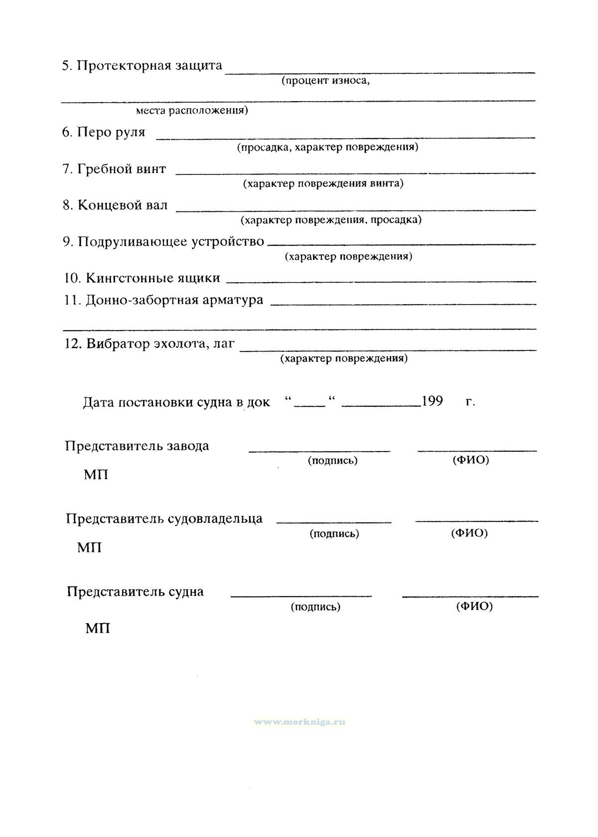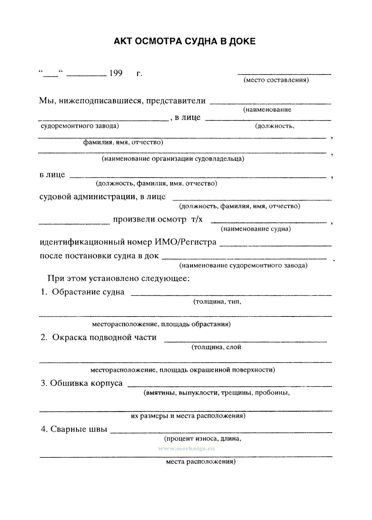 Форма Акта осмотра судна в доке соответствует Приложению N 3 к РД 31.20.01-97. "Правила технической эксплуатации морских судов. Основное руководство" утв. Минтрансом РФ 08.04.1997 N МФ-34/672.