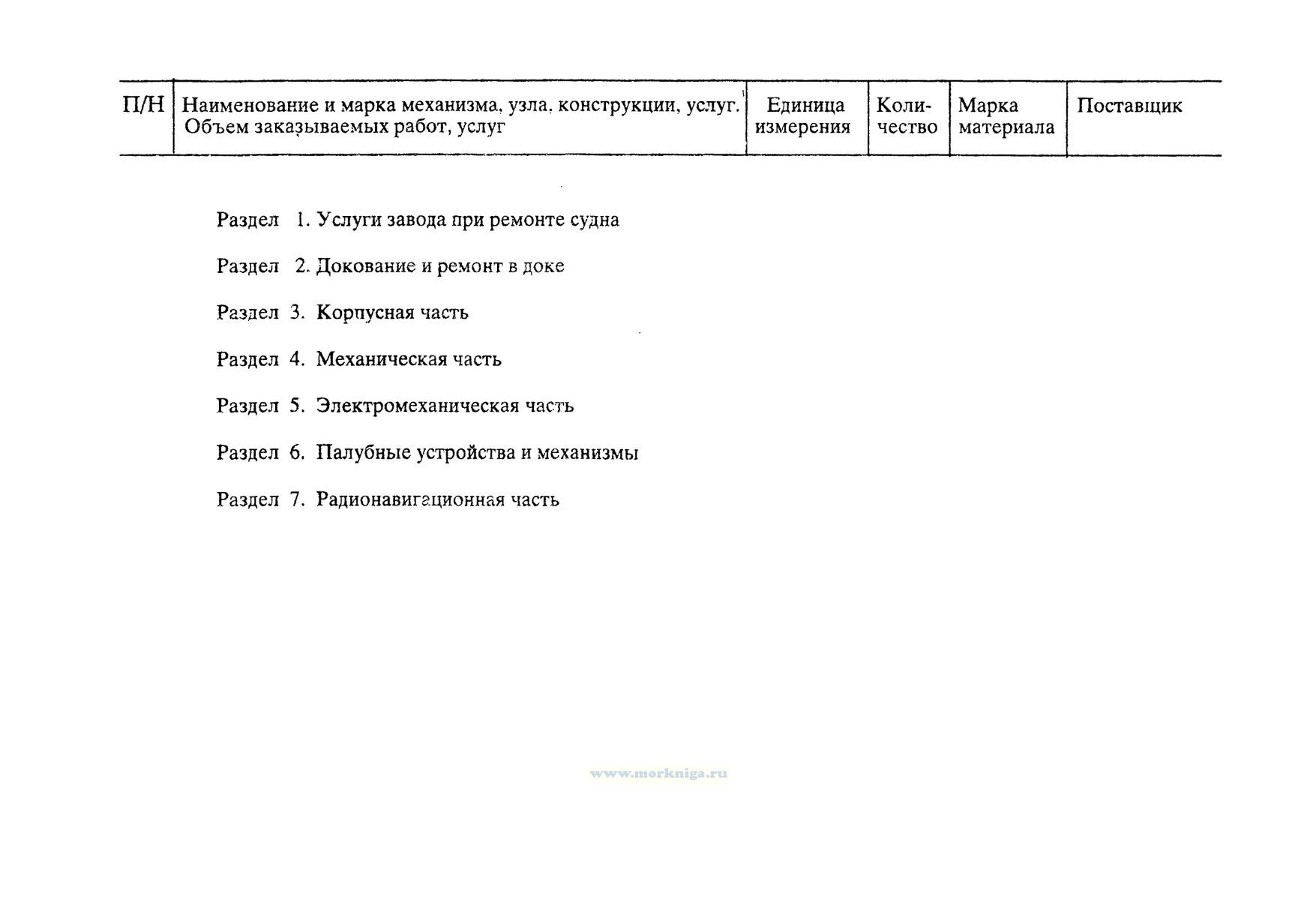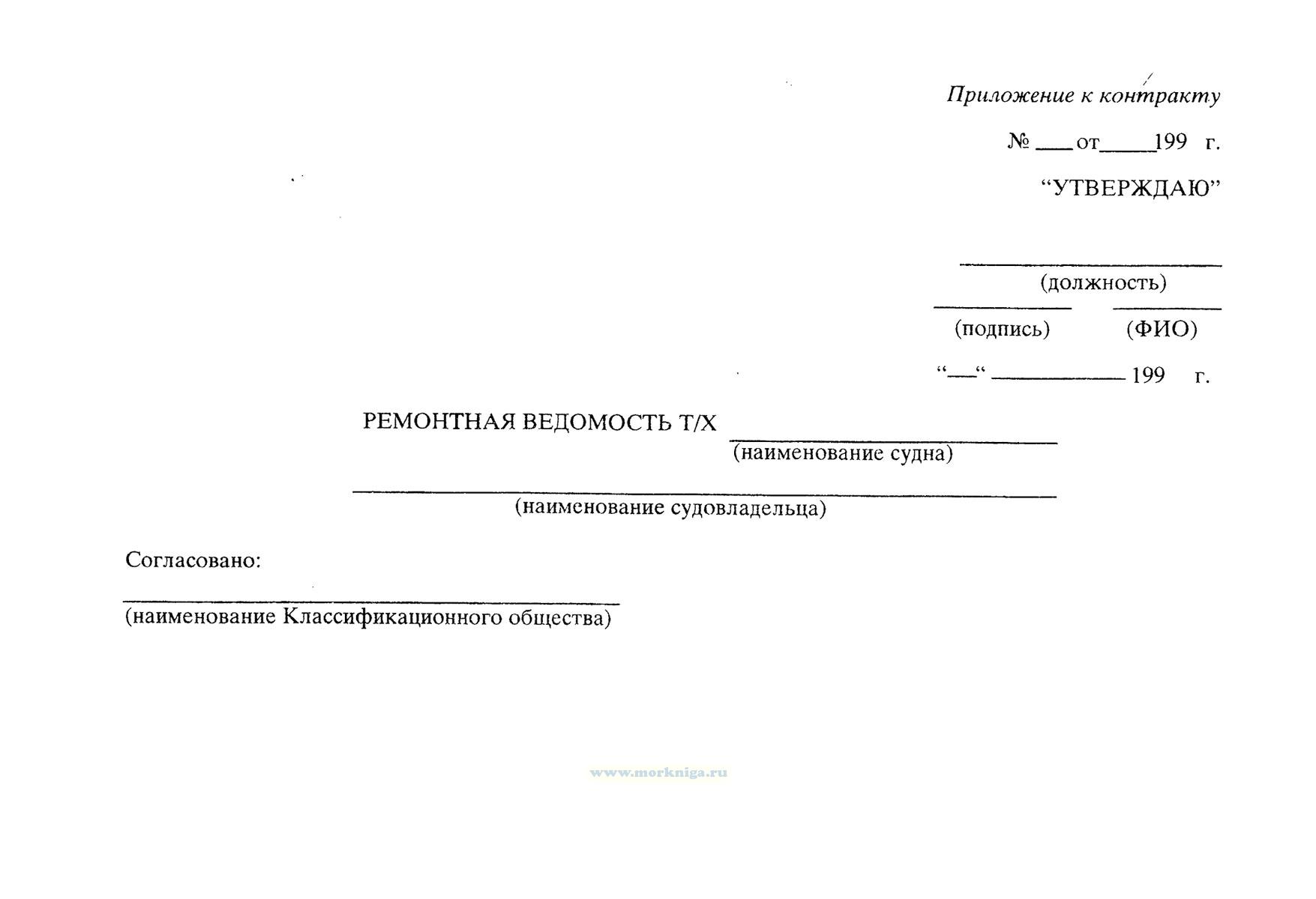 Форма Ремонтной ведомости Т/Х соответствует Приложению N 3 к РД 31.20.01-97. "Правила технической эксплуатации морских судов. Основное руководство" утв. Минтрансом РФ 08.04.1997 N МФ-34/672.