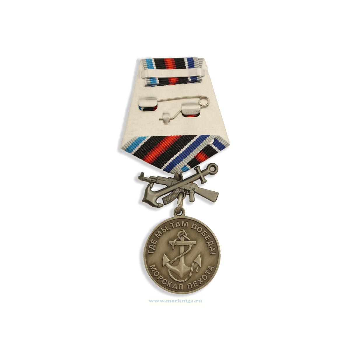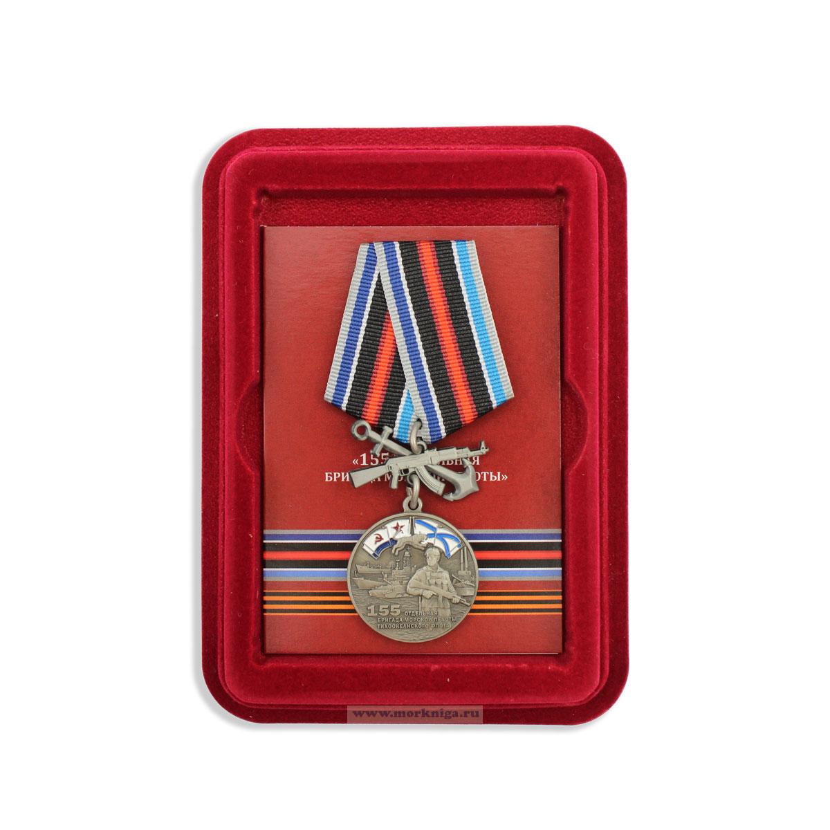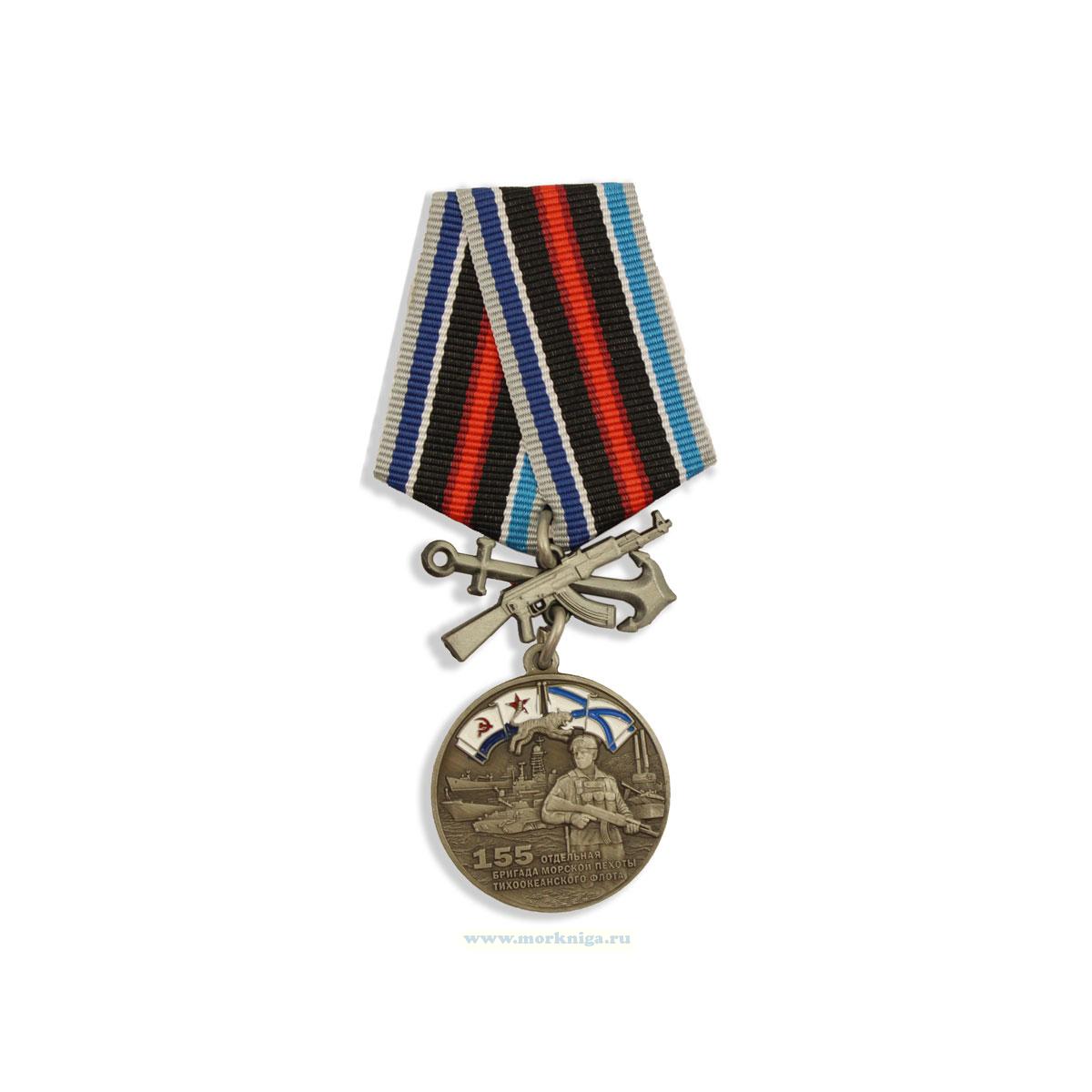 Памятная медаль, посвященная 155-й отдельной бригаде морской пехоты Тихоокеанского флота, изготовлена из латуни диаметром 32?мм. На лицевой стороне изображен морской пехотинец с автоматом на фоне боевых кораблей, боевой техники и памятников, а сверху - эмблема бригады - тигр в ранг флагов ВМФ СССР и ВМФ России. В нижней части рельефно нанесена надпись: "155?ОТДЕЛЬНАЯ БРИГАДА МОРСКОЙ ПЕХОТЫ ТИХООКЕАНСКОГО ФЛОТА". Обратная сторона украшена эмблемой морской пехоты - якорем, а вокруг размещен девиз: "ГДЕ МЫ, ТАМ ПОБЕДА! МОРСКАЯ ПЕХОТА". Медаль крепится посредством автомата и якоря, символически перекрещенных, и подвешена к пятиугольной колодке с муаровой лентой.