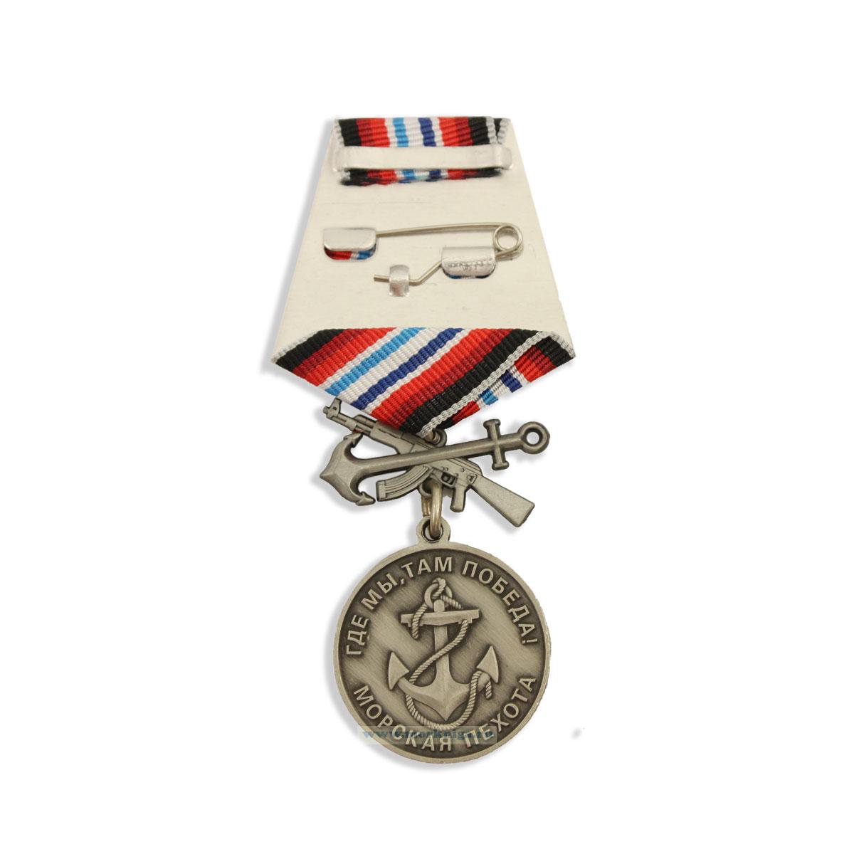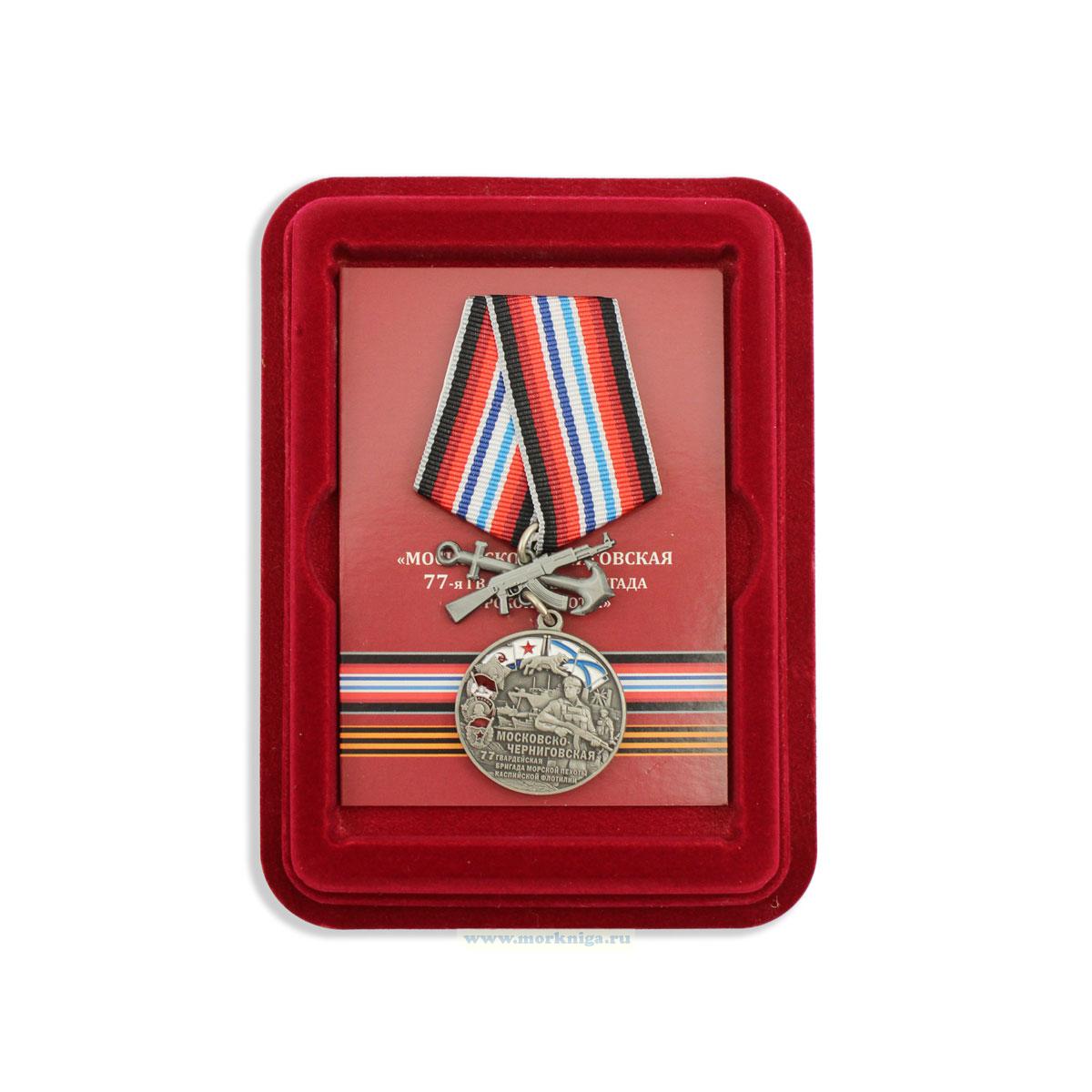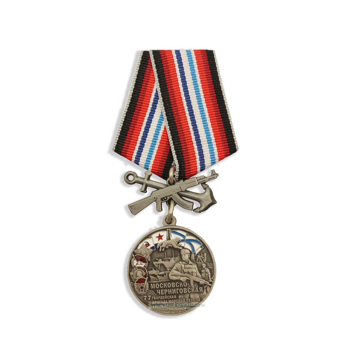 Памятная медаль посвящена 77-й гвардейской Московско-Черниговской бригаде морской пехоты Каспийской флотилии. На лицевой стороне изображен морской пехотинец на фоне военной техники и кораблей, рядом с историческими орденами соединения; в верхней части - флаги ВМФ СССР и Андреевский. На обороте размещен символ морской пехоты - якорь с девизом: "Где мы — там победа! Морская пехота".