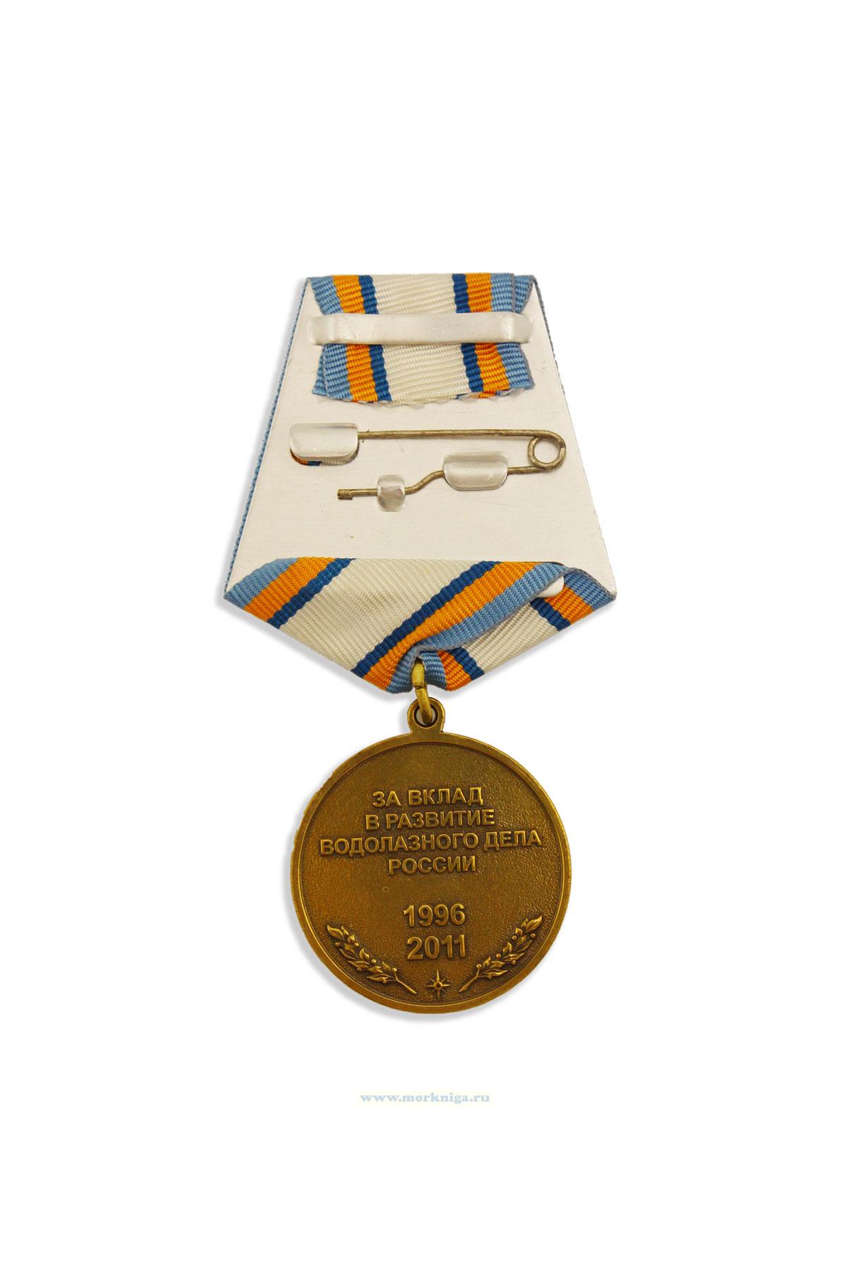 На лицевой стороне изображены водолазный шлем, якоря и эмблема МЧС России. Надпись по окружности: "ВОДОЛАЗНАЯ СЛУЖБА МЧС РОССИИ". Внизу - "15 ЛЕТ". На оборотной стороне надпись: "ЗА ВКЛАД В РАЗВИТИЕ ВОДОЛАЗНОГО ДЕЛА РОССИИ. 1996-2011", обрамленная лавровыми ветвями.