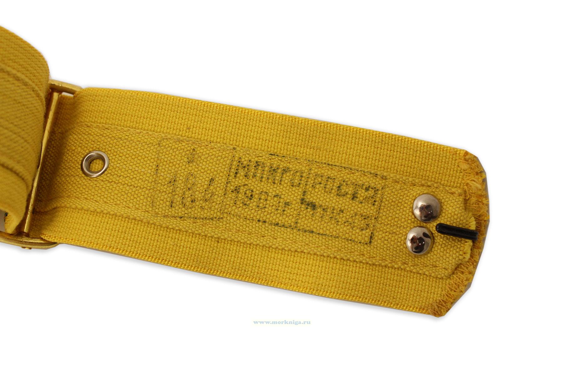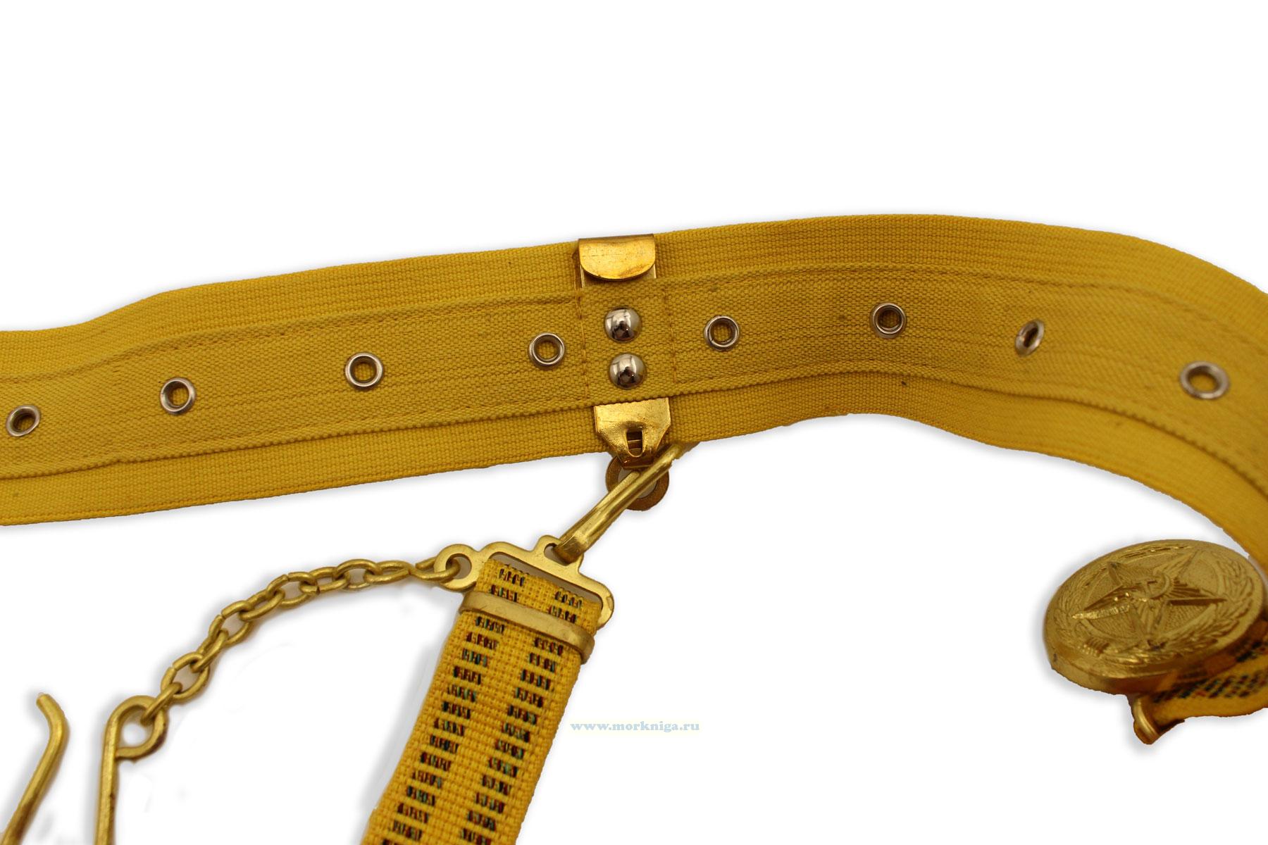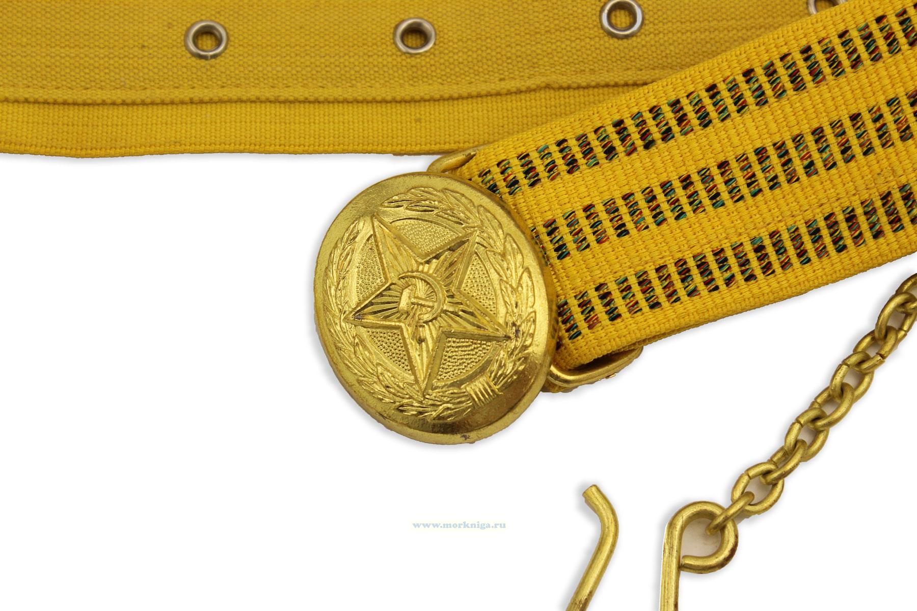 Парадный ремень для кортика офицеров ВВС СССР - элемент форменного обмундирования, предназначенный для ношения с парадной формой во время торжеств и памятных дат. Изготовлен из ярко-желтой ленты с декоративными полосами и подвесами на карабинах для крепления кортика. Металлические детали выполнены в золотистом тоне, центральная круглая пряжка украшена советской символикой.