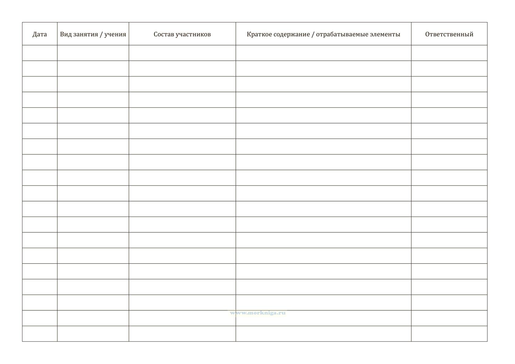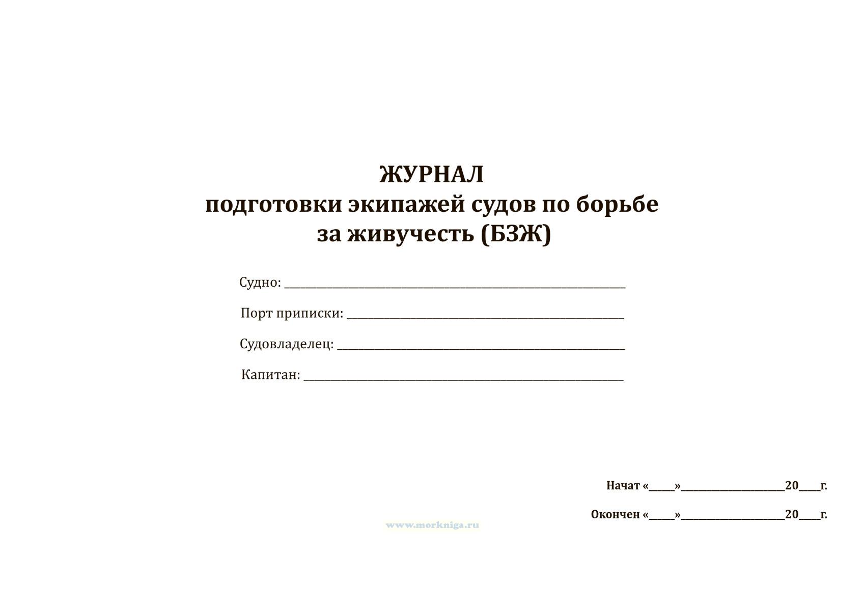 Журнал предназначен для ведения учёта и фиксации занятий и учений, проводимых на судне в целях поддержания готовности экипажа к действиям в аварийных ситуациях. В нём отражаются даты, вид занятий, состав участников, отрабатываемые элементы и ответственные лица, что позволяет документально подтверждать подготовку, контролировать её регулярность и полноту, а также обеспечивать отчётность перед надзорными органами. Журнал подготовки экипажей судов по борьбе за живучесть (БЗЖ) имеет грфы: Дата Вид занятия / учения Состав участников Краткое содержание / отрабатываемые элементы Ответственный