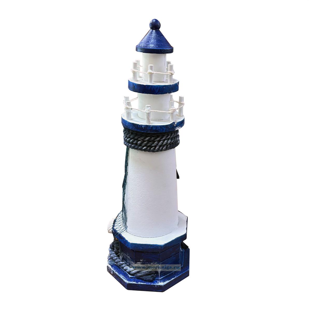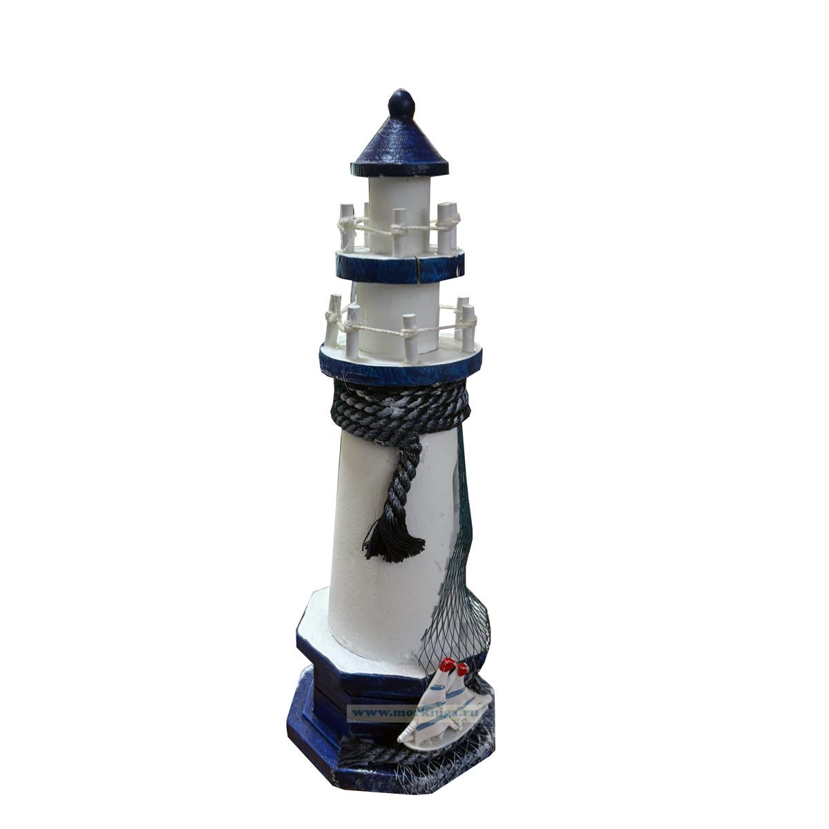 Интерьерный сувенир "Маяк" в морском стиле станет стильным украшением для дома, офиса или кафе. Декор выполнен из дерева и украшен элементами в виде каната, рыбацкой сети и миниатюрного парусника. Сочетание белого и синего цветов создает атмосферу приморского уюта и путешествий. Подходит для оформления гостиной, ванной комнаты, дачи или в качестве подарка любителям моря и навигационной тематики.