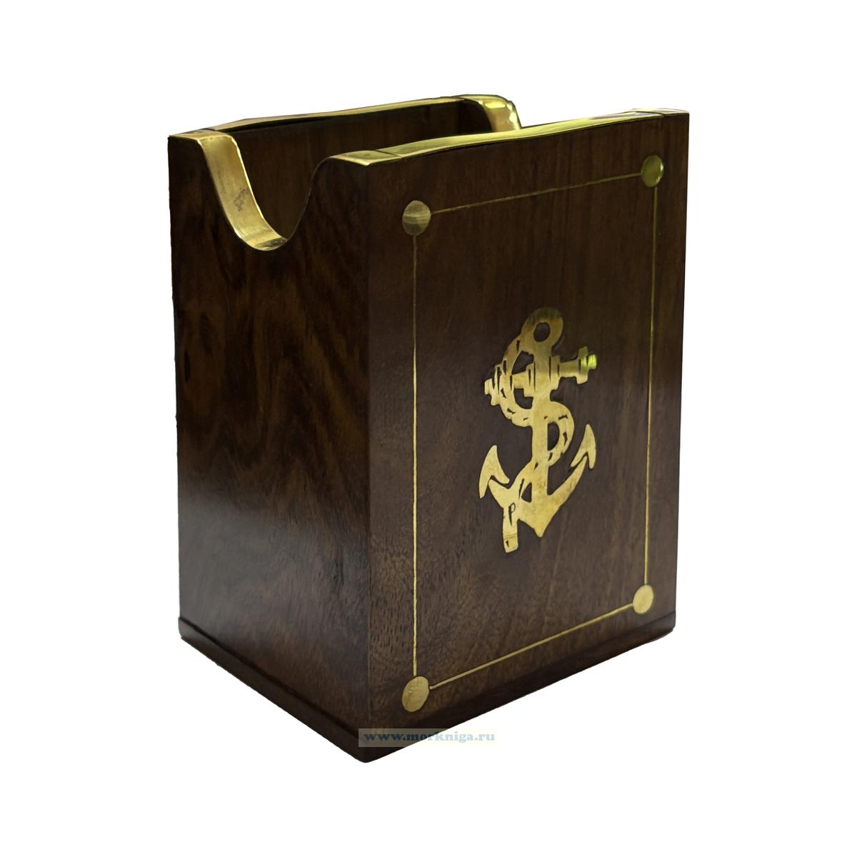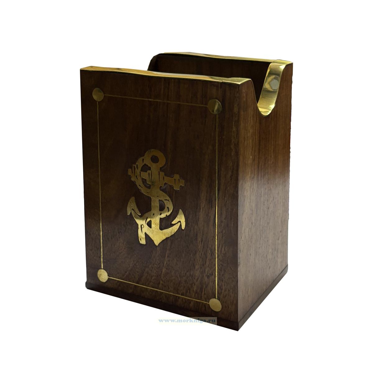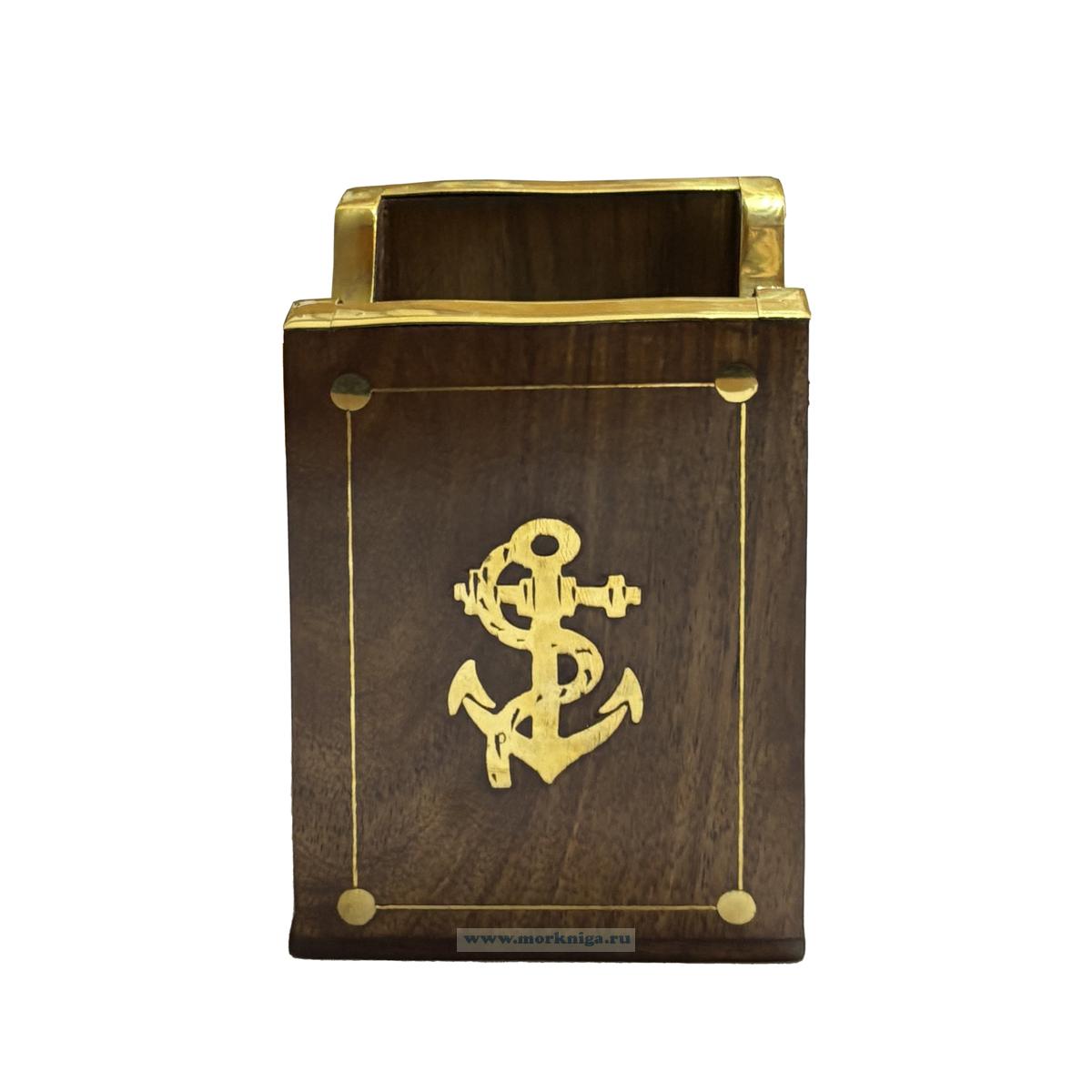 Стильная настольная карандашница, выполненная из массива палисандра, станет эффектным акцентом в рабочем пространстве. Богатая фактура натурального дерева подчеркнута гладкой полировкой и аккуратными латунными вставками. На лицевой стороне - декоративный якорь, символ устойчивости, твердости и уверенного движения вперед.