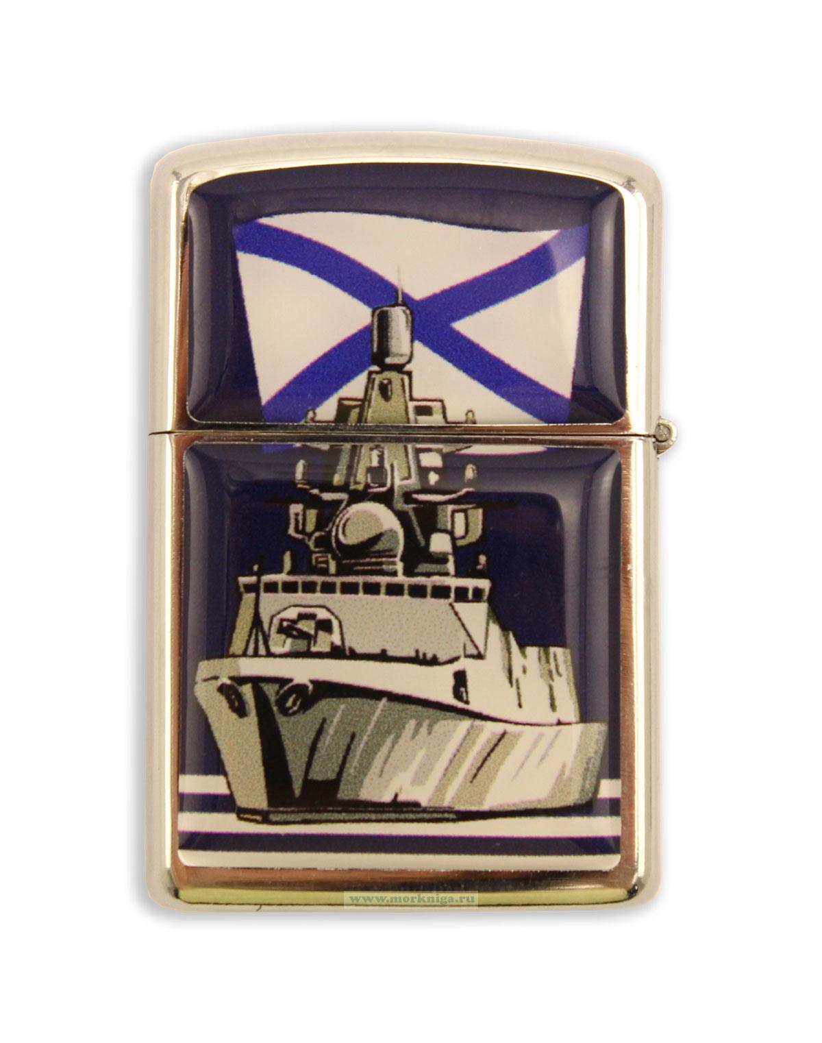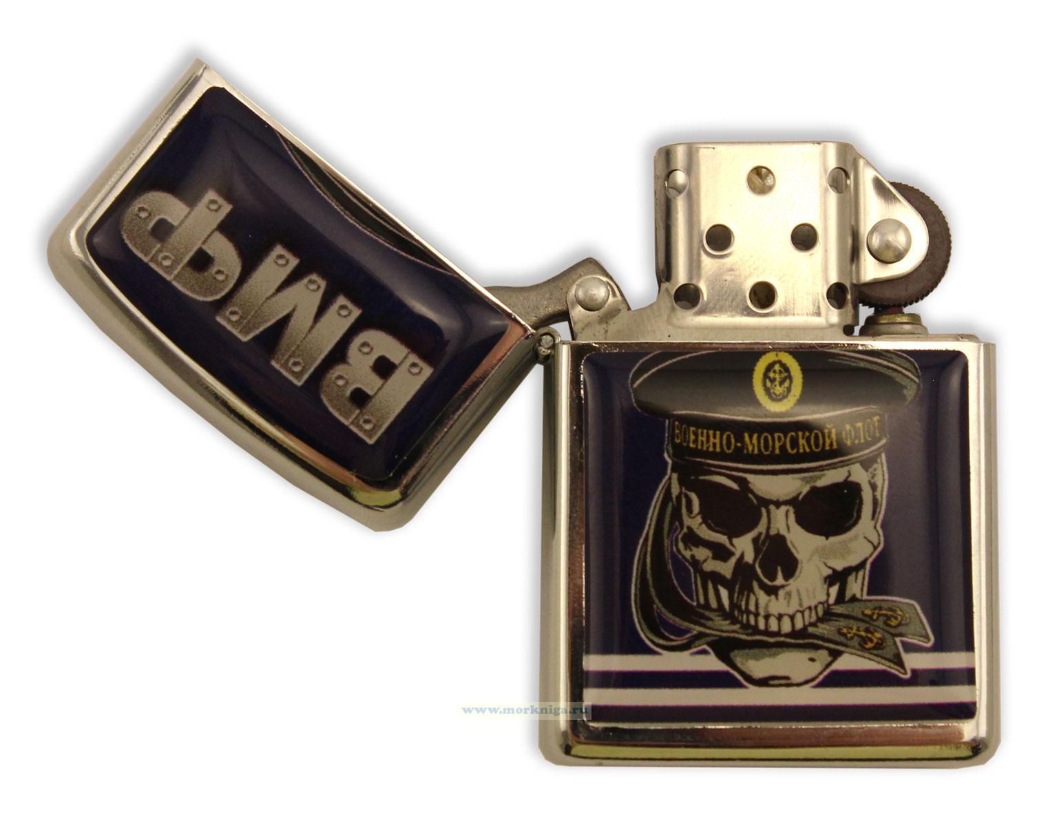 Бензиновая зажигалка серебряного цвета, оформленная в стилистике Военно-морского флота. На боковых поверхностях изображены череп в фуражке с надписью "ВМФ", корабль и Андреевский флаг. Зажигалка предназначена для повседневного использования и может служить тематическим сувениром или подарком.