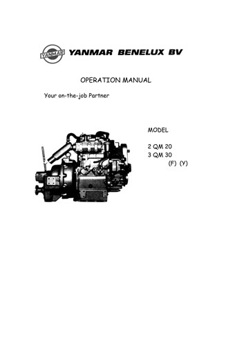 This is the operating manual for Yanmar marine diesel engines models 2QM20 and 3QM30. It contains instructions for starting, stopping, maintaining, checking systems, preparing for long-term storage, and troubleshooting. Fuel, oil, and cooling system requirements are also described, including diagrams, illustrations, and precautions.