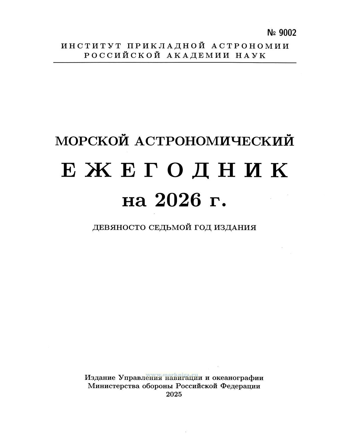 "Морской астрономический ежегодник на 2026 г." (МАЕ) предназначен для вычисления гринвичских часовых углов и склонений навигационных светил с точностью 0.1' на любой момент времени, а также некоторых других величин, используемых при решении ряда задач морской астронавигации. Основные эфемериды представлены в виде ежедневных таблиц. Наличие ряда вспомогательных таблиц позволяет решать штурманские задачи методами классической мореходной астрономии без привлечения дополнительных пособий. В объяснении к МАЕ даны примеры решения основных задач морской астронавигации. МАЕ рекомендуется как независимый от технических средств способ навигации.