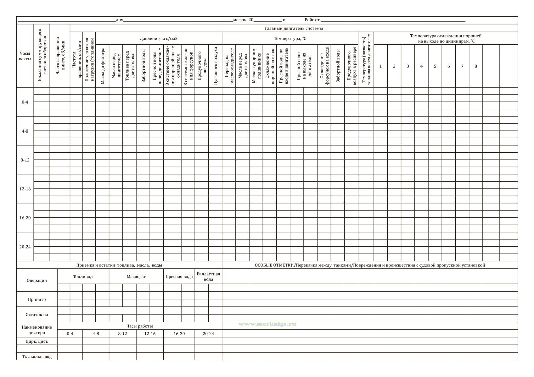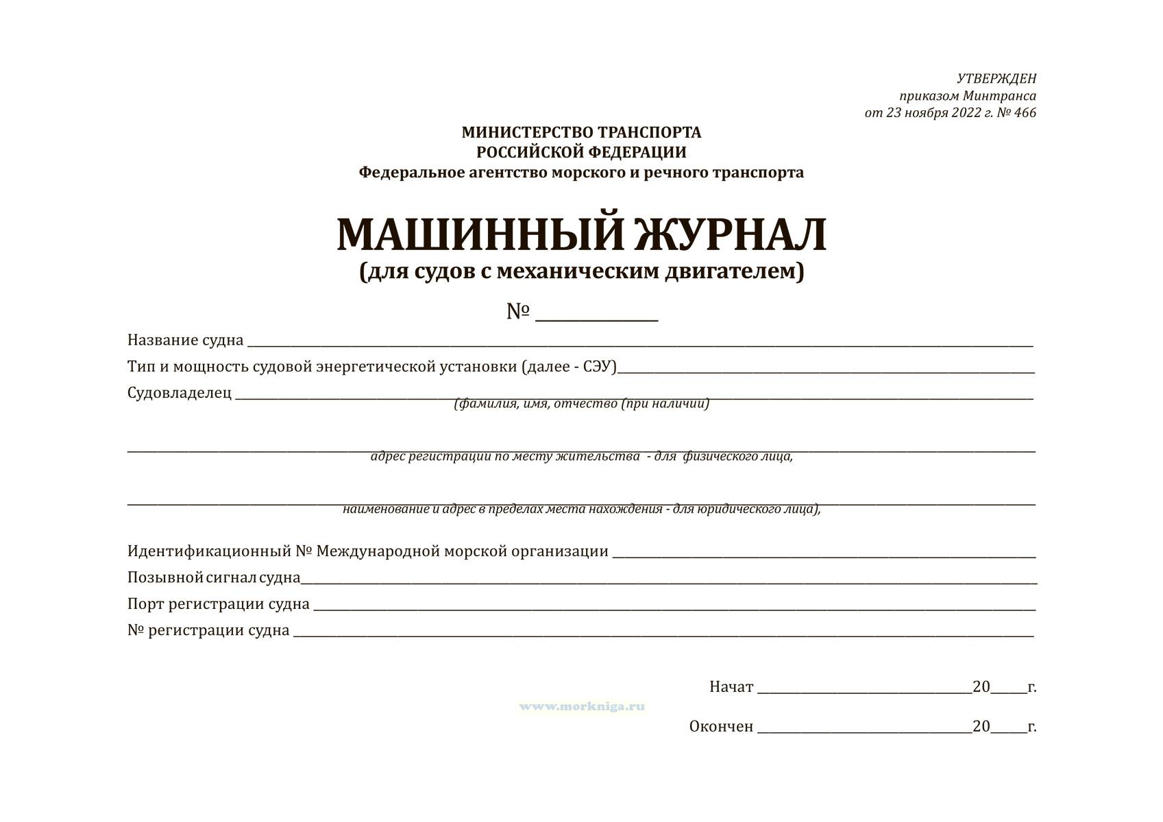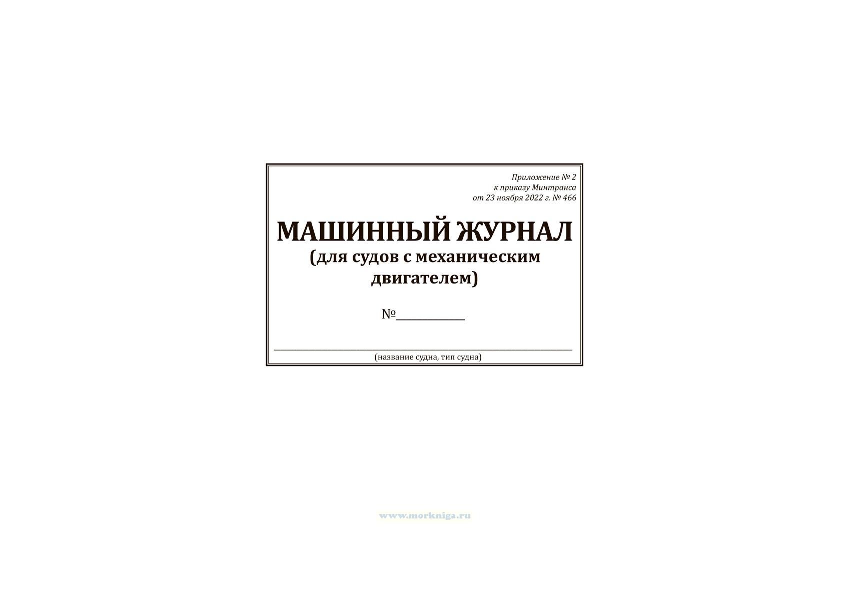 Форма Машинного журнала (для судов с механическим двигателем) утверждена Приложением N 2 к Приказу Минтранса России от 23.11.2022 N 466 "Об установлении правил ведения судовых документов" Машинный журнал для судов с механическим двигателем применяется для фиксации и учёта всех данных, связанных с работой судовой энергетической установки и вспомогательных механизмов, регистрации параметров их работы, технического состояния, проведения ремонтных и обслуживающих операций, а также происшествий и аварий во время плавания и стоянки судна.