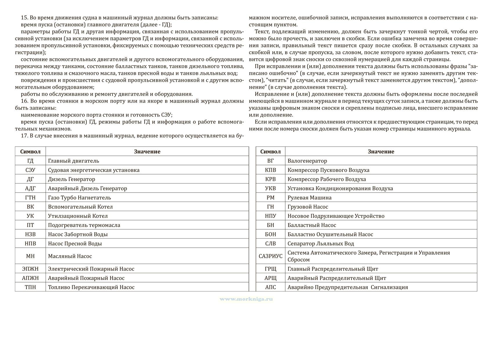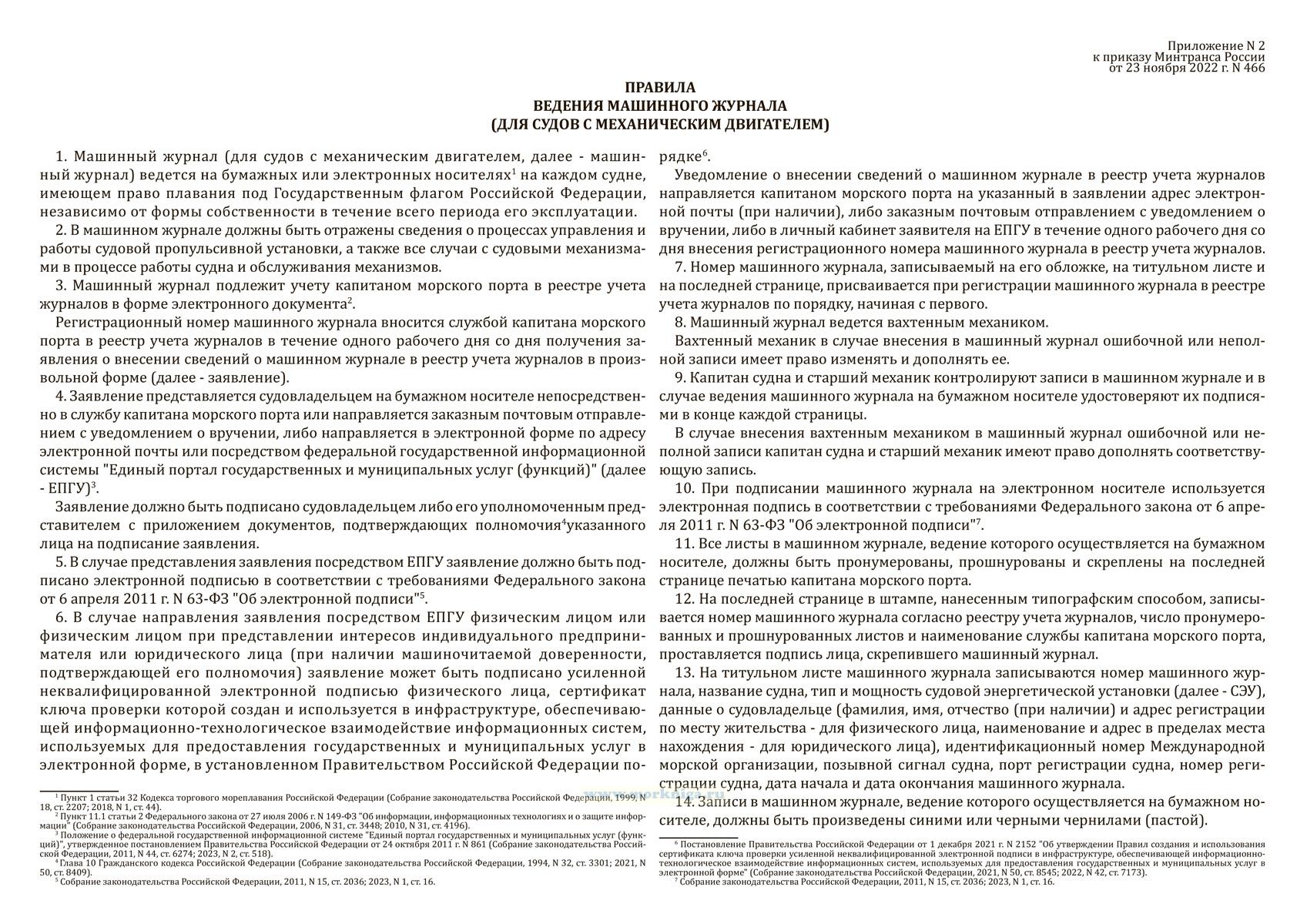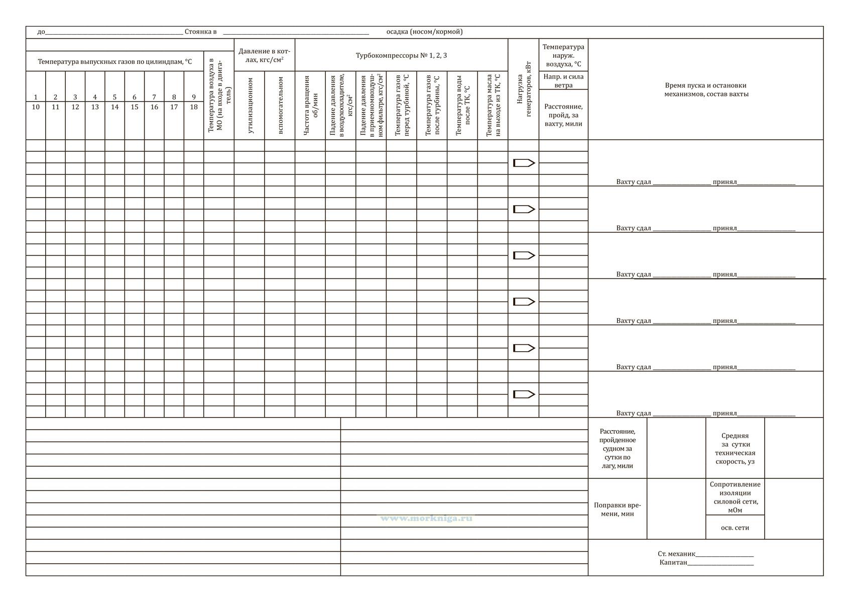 Форма Машинного журнала (для судов с механическим двигателем) утверждена Приложением N 2 к Приказу Минтранса России от 23.11.2022 N 466 "Об установлении правил ведения судовых документов" Машинный журнал для судов с механическим двигателем применяется для фиксации и учёта всех данных, связанных с работой судовой энергетической установки и вспомогательных механизмов, регистрации параметров их работы, технического состояния, проведения ремонтных и обслуживающих операций, а также происшествий и аварий во время плавания и стоянки судна.