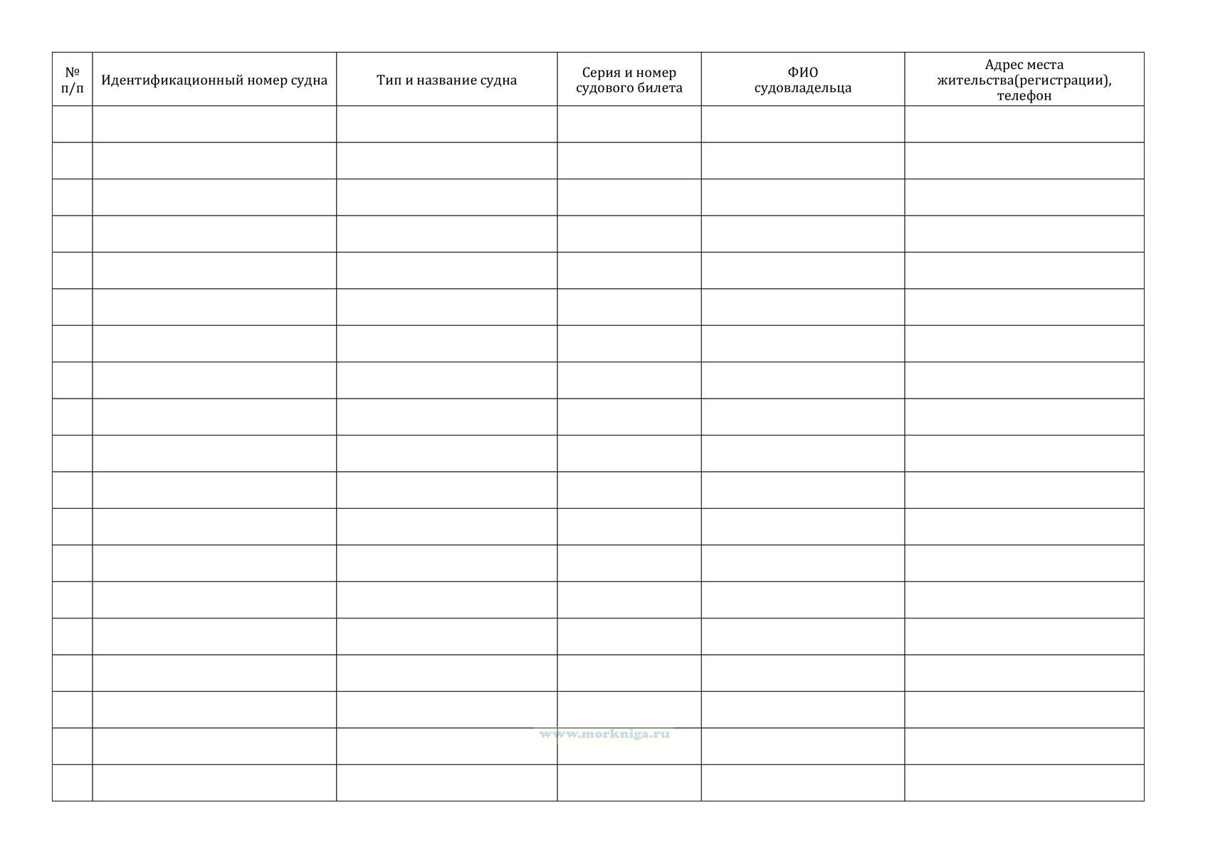 Журнал применяется для регистрации и учета приписных судов базы-стоянки, систематизации сведений о судах и их владельцах, обеспечения контроля за составом приписного флота и использования этих данных в справочной и учетной работе. Журнал регистрации приписного флота базы-стоянки имеет графы: № п/п Идентификационный номер судна Тип и название судна Серия и номер судового билета ФИО судовладельца Адрес места жительства(регистрации), телефон