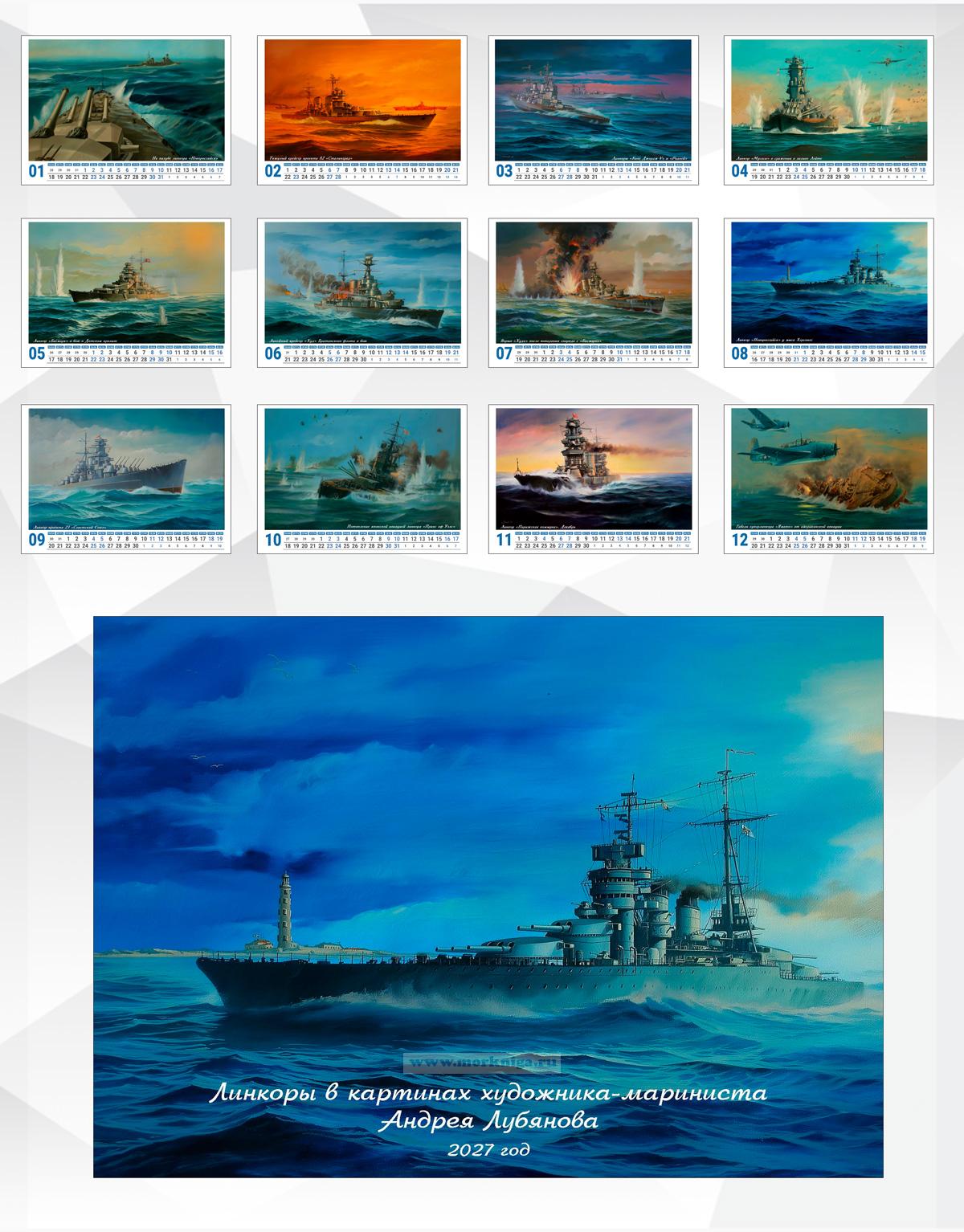 Календарь содержит изображения 12 работ художника-мариниста Андрея Лубянова: - На палубе линкора "Новороссийск" - Тяжёлый крейсер проекта 82 "Сталинград" - Линкоры "Кинг Джордж V" и "Родней" - Линкор "Мусаси" в сражении в заливе Лейте - Линкор "Бисмарк" в бою в Датском проливе - Линейный крейсер "Худ" в бою - Взрыв "Худа" после попадания снаряда с "Бисмарка" - Линкор "Новороссийск" у мыса Херсонес - Линкор проекта 23 "Советский Союз" - Потопление линкора "Принс оф Уэлс" японской авиацией - Линкор "Парижская коммуна". Декабрь 1941 года - Гибель суперлинкора "Ямато" от ударов американской авиации