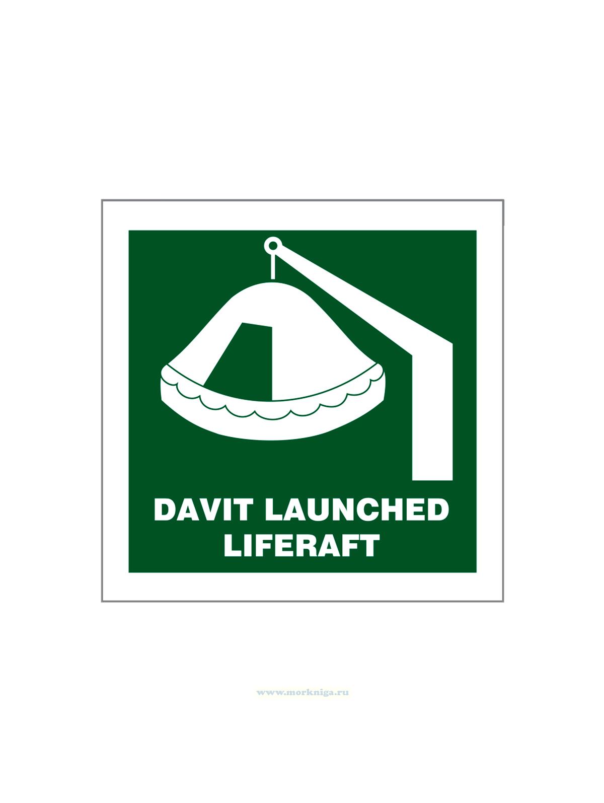 Наклейка "Davit launched liferaft" с надписью, символ ИМО на самоклеящейся фотолюминесцентной пленке, 15х15 см