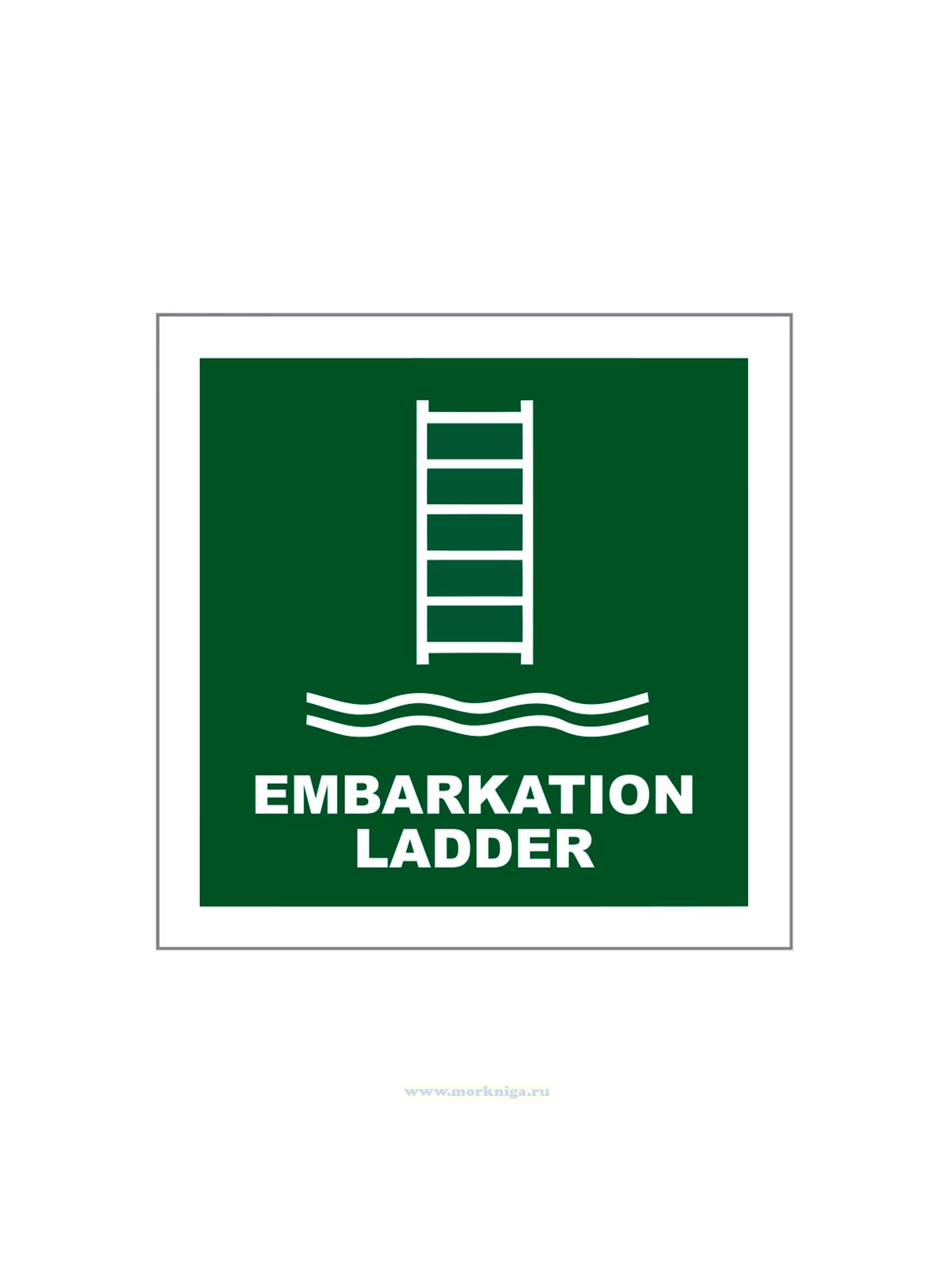 Наклейка "Embarkation ladder" обозначает специальную аварийную лестницу, предназначенную для безопасного подъема и спуска людей на спасательные шлюпки или плоты с борта судна в условиях экстренной эвакуации.