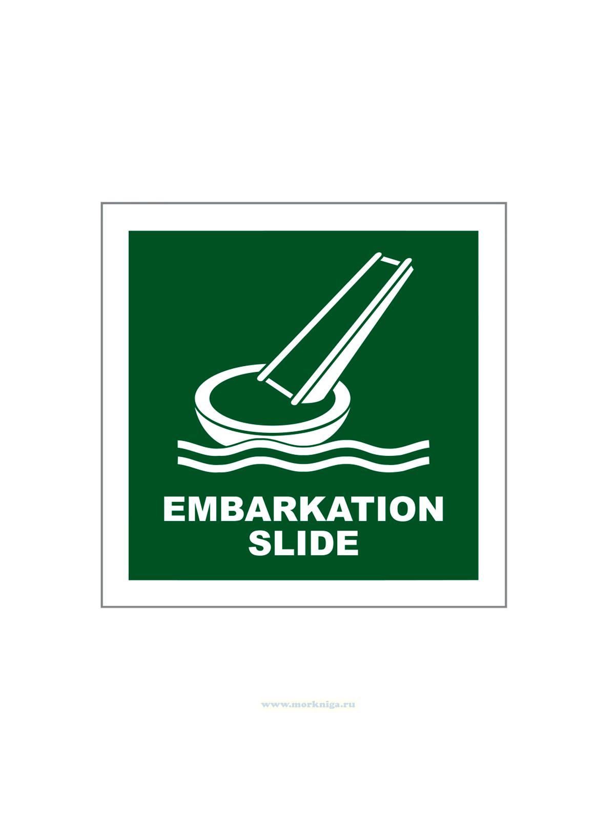 Наклейка "Embarkation slide" обозначает аварийную спусковую систему в виде надувной или жесткой наклонной трубы, предназначенную для быстрой и безопасной эвакуации людей с высоких палуб судна прямо на спасательные шлюпки или плоты.