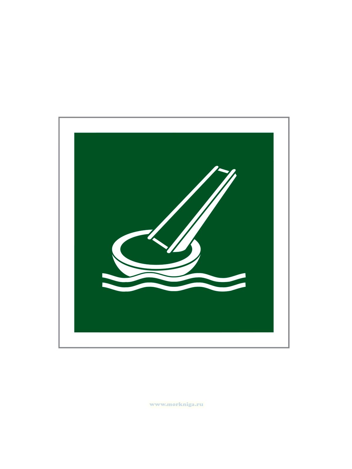Наклейка "Embarkation slide" обозначает аварийную спусковую систему в виде надувной или жесткой наклонной трубы, предназначенную для быстрой и безопасной эвакуации людей с высоких палуб судна прямо на спасательные шлюпки или плоты.