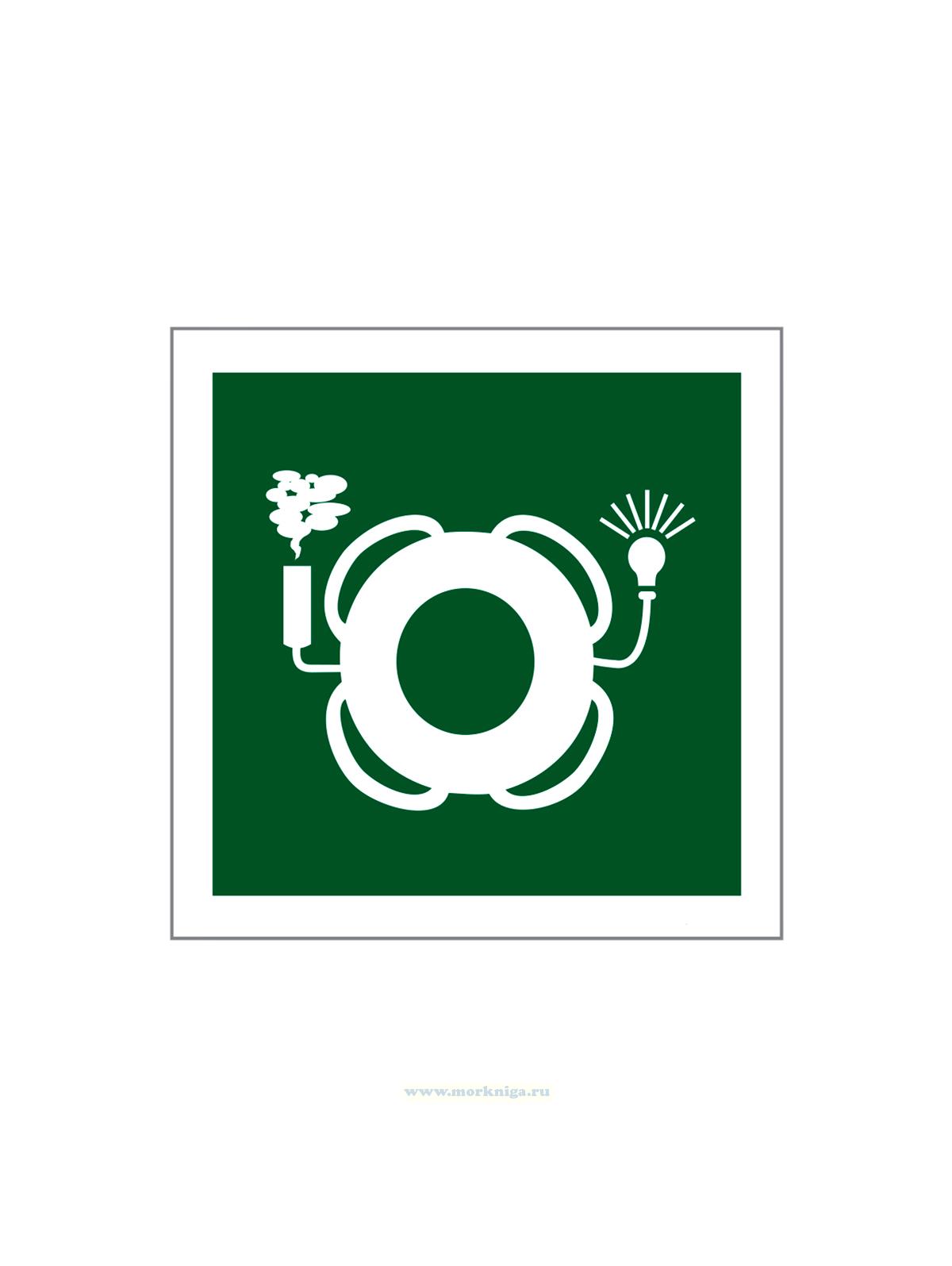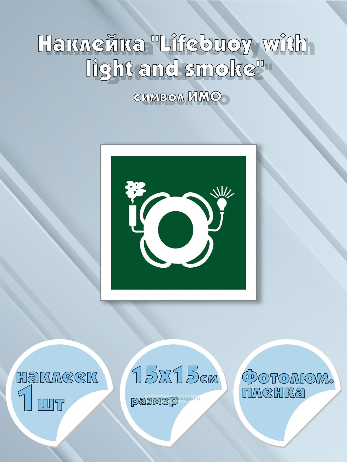 Наклейка "Lifebuoy with light and smoke" обозначает спасательный круг, оснащенный как самосветящимся сигналом, так и дымовым маркером, который при контакте с водой выделяет ярко видимый оранжевый дым — обеспечивая визуальную и аэрозольную маркировку места падения человека за борт.