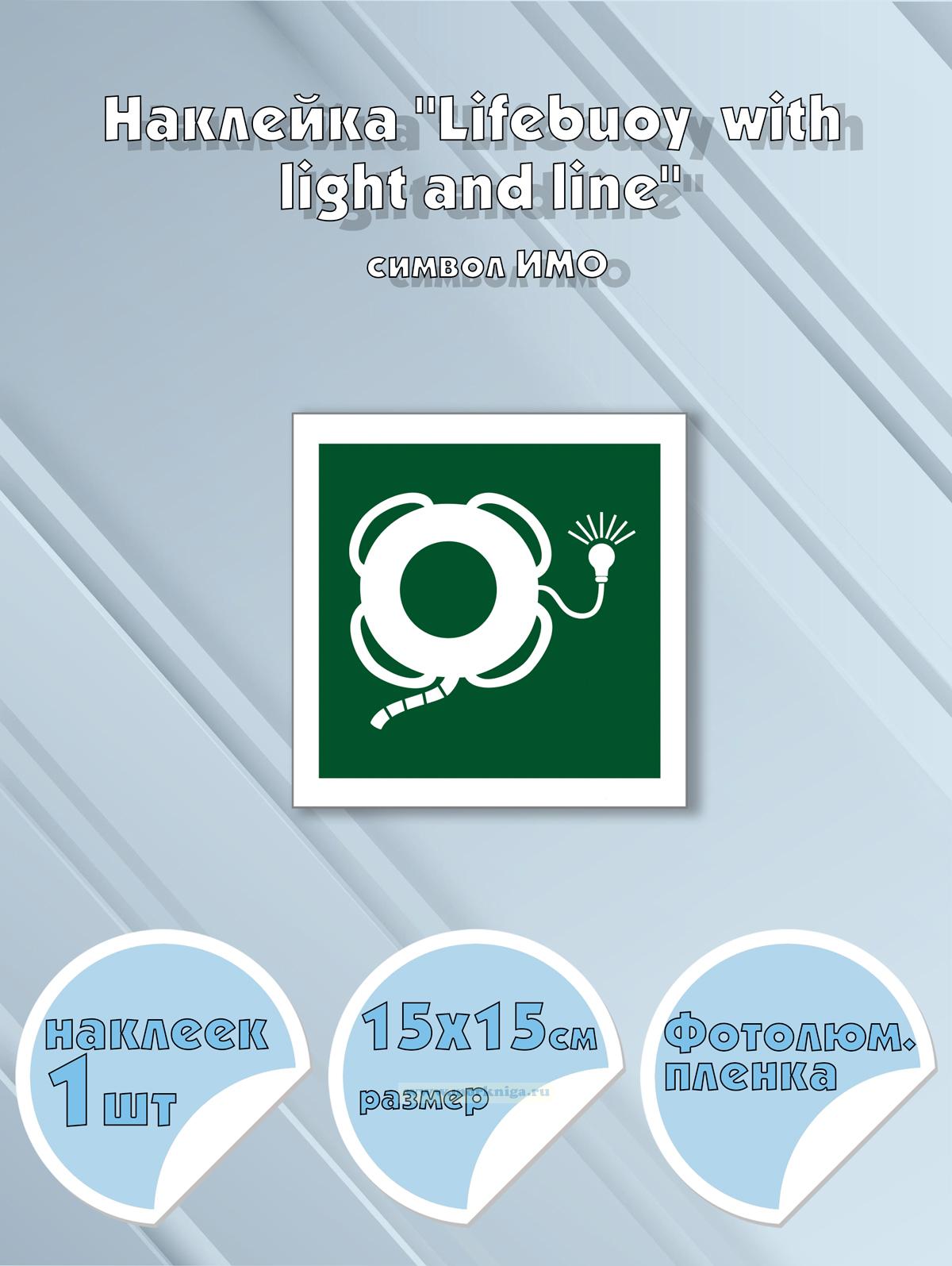 Наклейка "Lifebuoy with light and line" обозначает спасательный круг, оснащенный автоматически включающимся световым сигналом и прочной спасательной веревкой, позволяющей одновременно маркировать место падения человека за борт и подтягивать его обратно к судну.