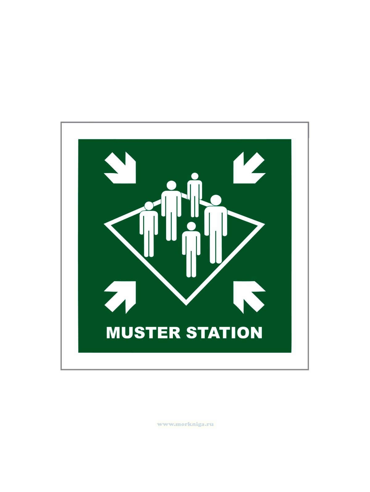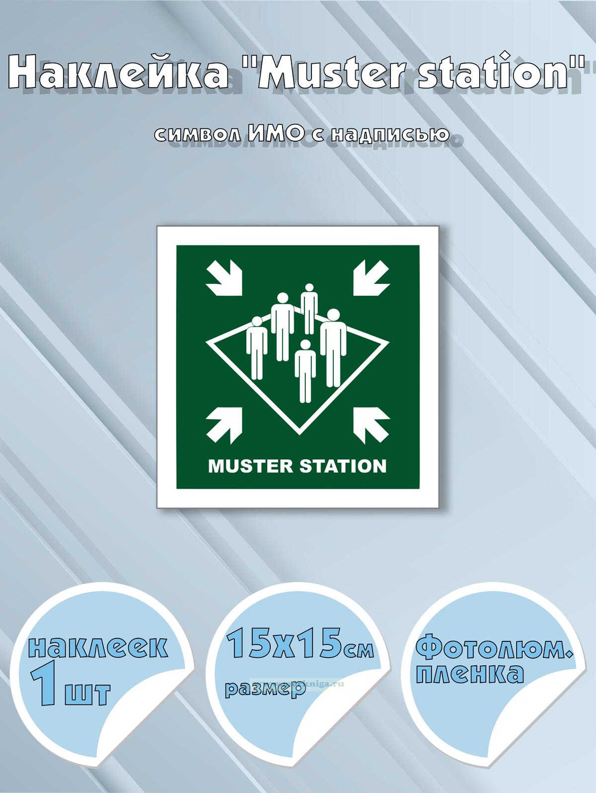 Наклейка "Muster station" с надписью, символ ИМО на самоклеящейся фотолюминесцентной пленке, 15х15 см