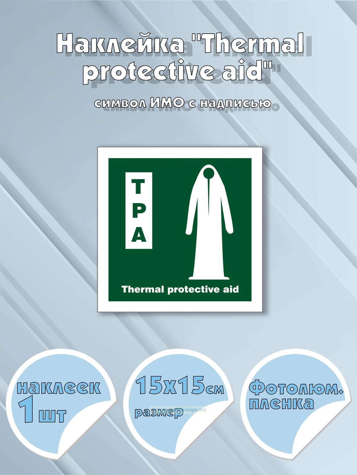 Наклейка "Thermal protective acid " указывает на место хранения средства термической защиты — легкого водонепроницаемого костюма, отражающего тепло тела. Она обозначает аварийное снаряжение, предназначенное для предотвращения переохлаждения человека в холодной воде или при нахождении в спасательной шлюпке.
