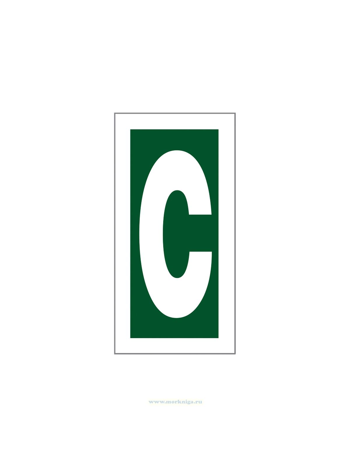 Наклейка предназначена для обозначения буквы "C" на судовых документах или оборудовании, что упрощает идентификацию. Она используется для быстрого визуального распознавания и ориентации в морской навигации и безопасности.