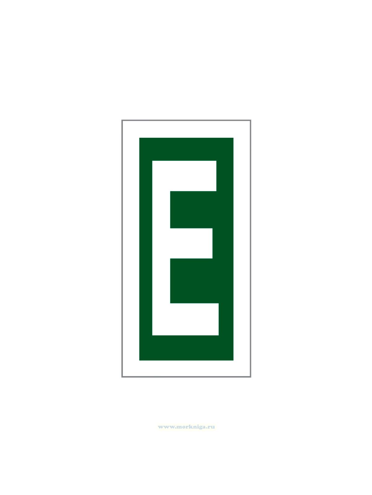 Наклейка предназначена для обозначения буквы "E" на судовых документах или оборудовании, что упрощает идентификацию. Она используется для быстрого визуального распознавания и ориентации в морской навигации и безопасности.