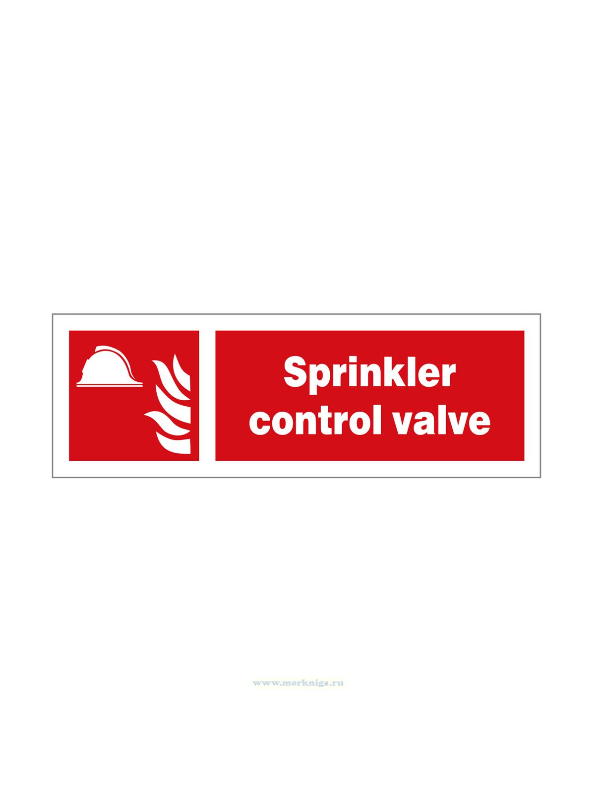 Наклейка "Sprinkler control valve" указывает на местоположение клапана, управляющего подачей воды в автоматическую систему пожаротушения, позволяя вручную включать или отключать её в зависимости от необходимости.