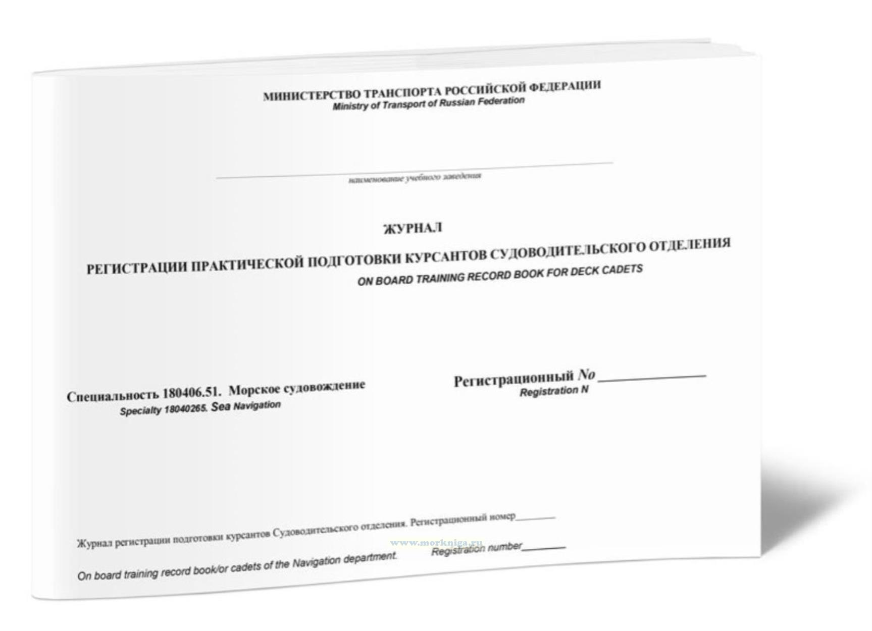 Журнал регистрации подготовки курсантов Судоводительского отделения. Регистрационный номер on board training record book/or cadets of the navigation department. registration number registration number ...