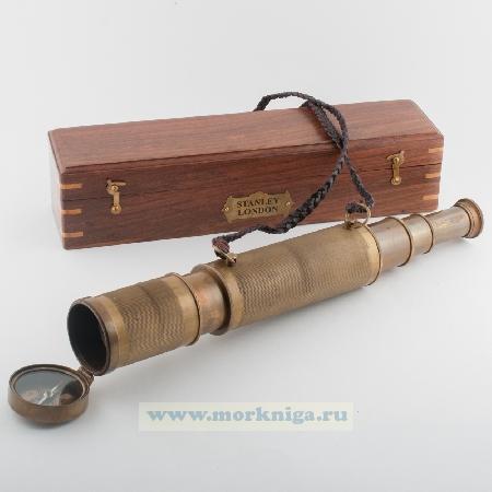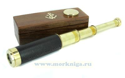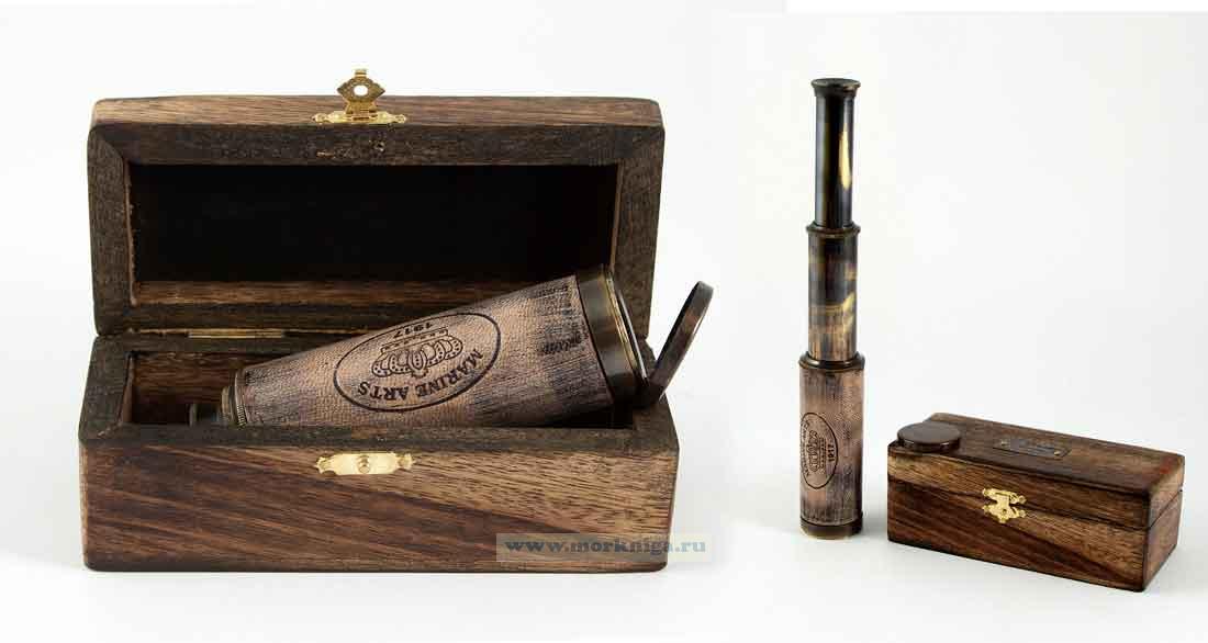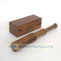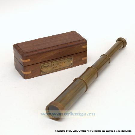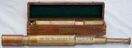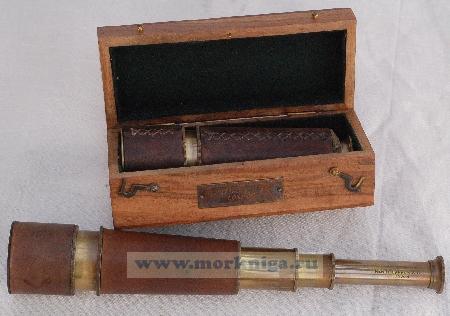 Габариты: длина - 38 см, ширина - 7 см, высота - 6 см, 6-кратаное увеличение, 4 складывающихся колена Линзы обработаны по старинной цейсовской технологии. Морская бронза....