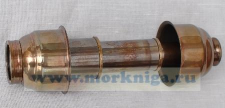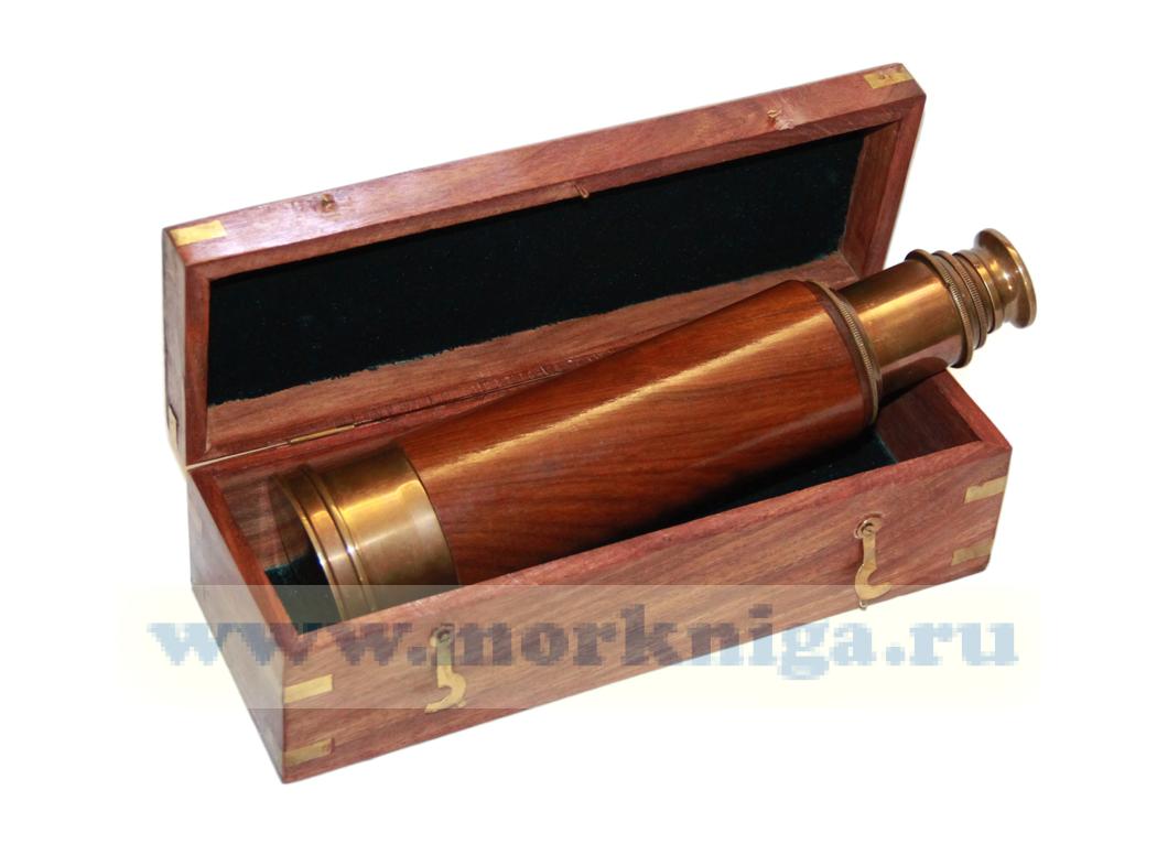 Четырехколенная бронзовая труба с козырьком от солнца в деревянной шкатулке. Габариты: Длина - 67 см Ширина - 4,5-3 см Размер шкатулки 32*8*7 Вес товара: 1,1 кг