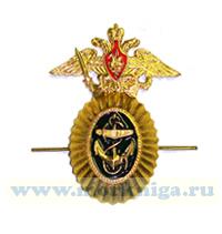 Материал: алюминий Размер: 5,5 х 6 см Крепление: клямер Для ВМФ кокарда изготовляется в виде овального медальона черного цвета с якорем и окружением из лучей....