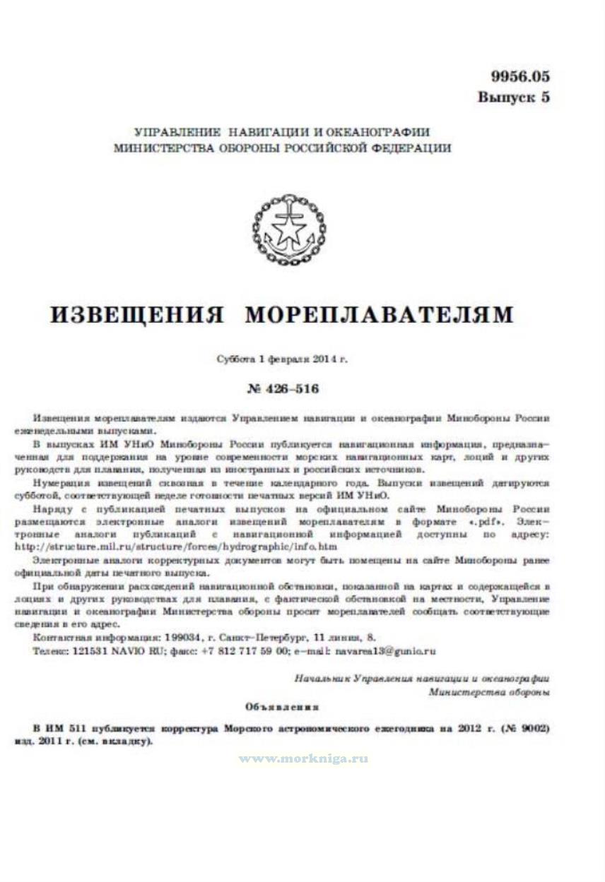 Извещения мореплавателям издаются Управлением навигации и океанографии Минобороны России еженедельными выпусками. В выпусках ИМ УНиО Минобороны России...